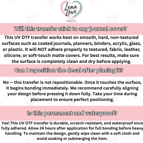 This high-quality UV DTF (Direct to Film) transfer arrives ready to use — no heat press needed. Simply peel, stick, press, and reveal a vibrant, durable design that looks professionally printed onto your journal cover.