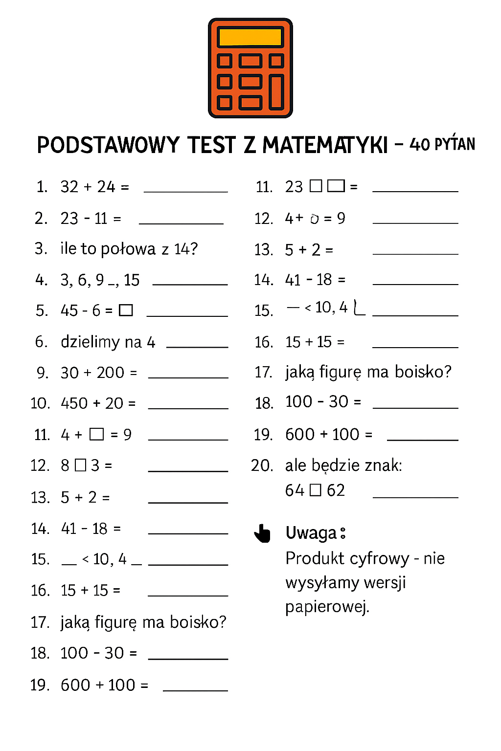 🧮 Podstawowy Test z Matematyki dla Dzieci – 40 Pytań z Odpowiedziami | PDF do druku