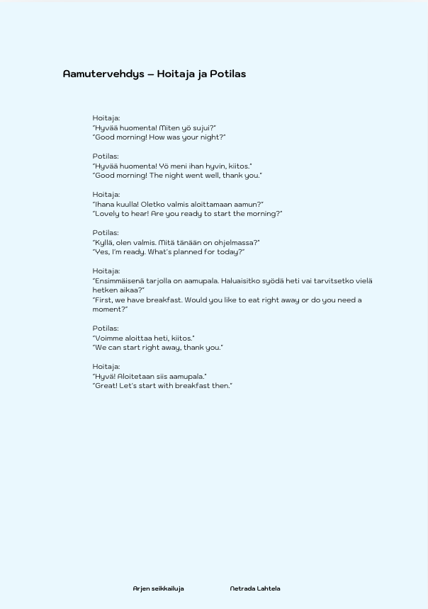 Description: Dialogue between a nurse and a patient in a nursing home in Finland.