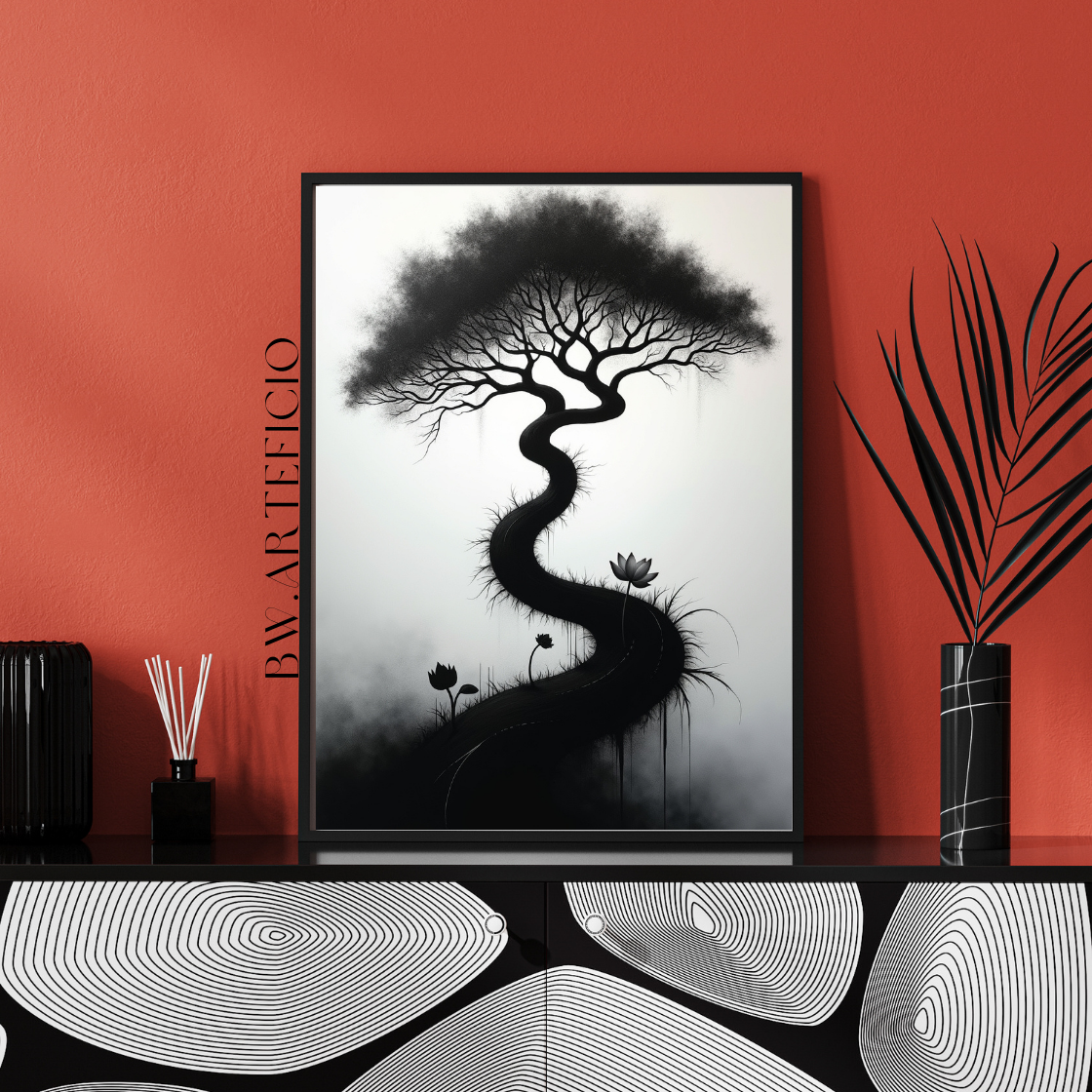 The artwork likely symbolizes a journey or path of life, with the winding trunk representing the twists and turns one encounters. The tree's canopy could signify growth, and the lotus flowers at the base might symbolize purity and enlightenment. This artwork would pair well with modern and minimalist decor. It can be complemented with black and white furniture, geometric patterns, and a few accent pieces in bold colors like red or gold.