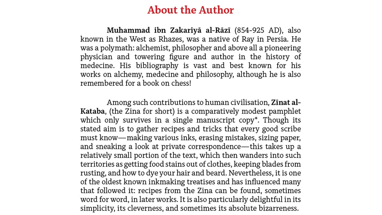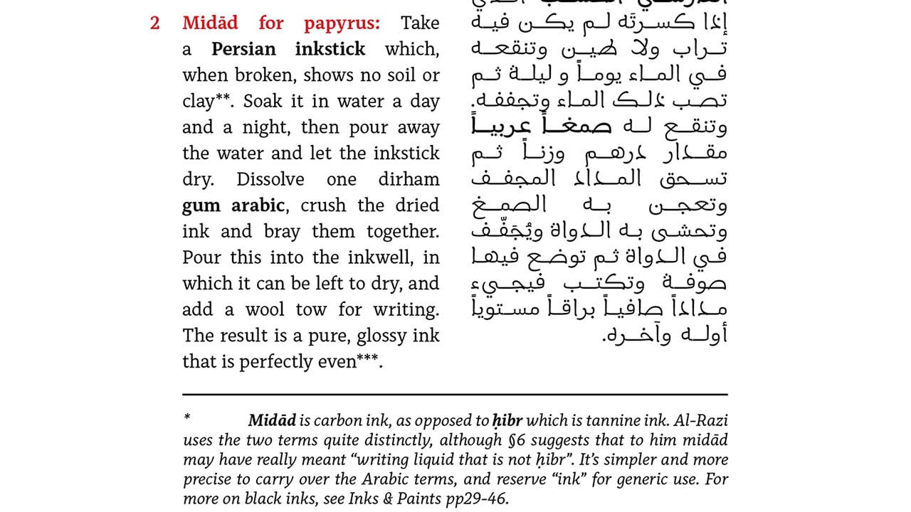 A practical translation into English of one of the oldest known Arabic-language inkmaking treatises, written by the polymath al-Razi in the 10th century. The original transcription is included, along with abundant footnotes. 40 pages.