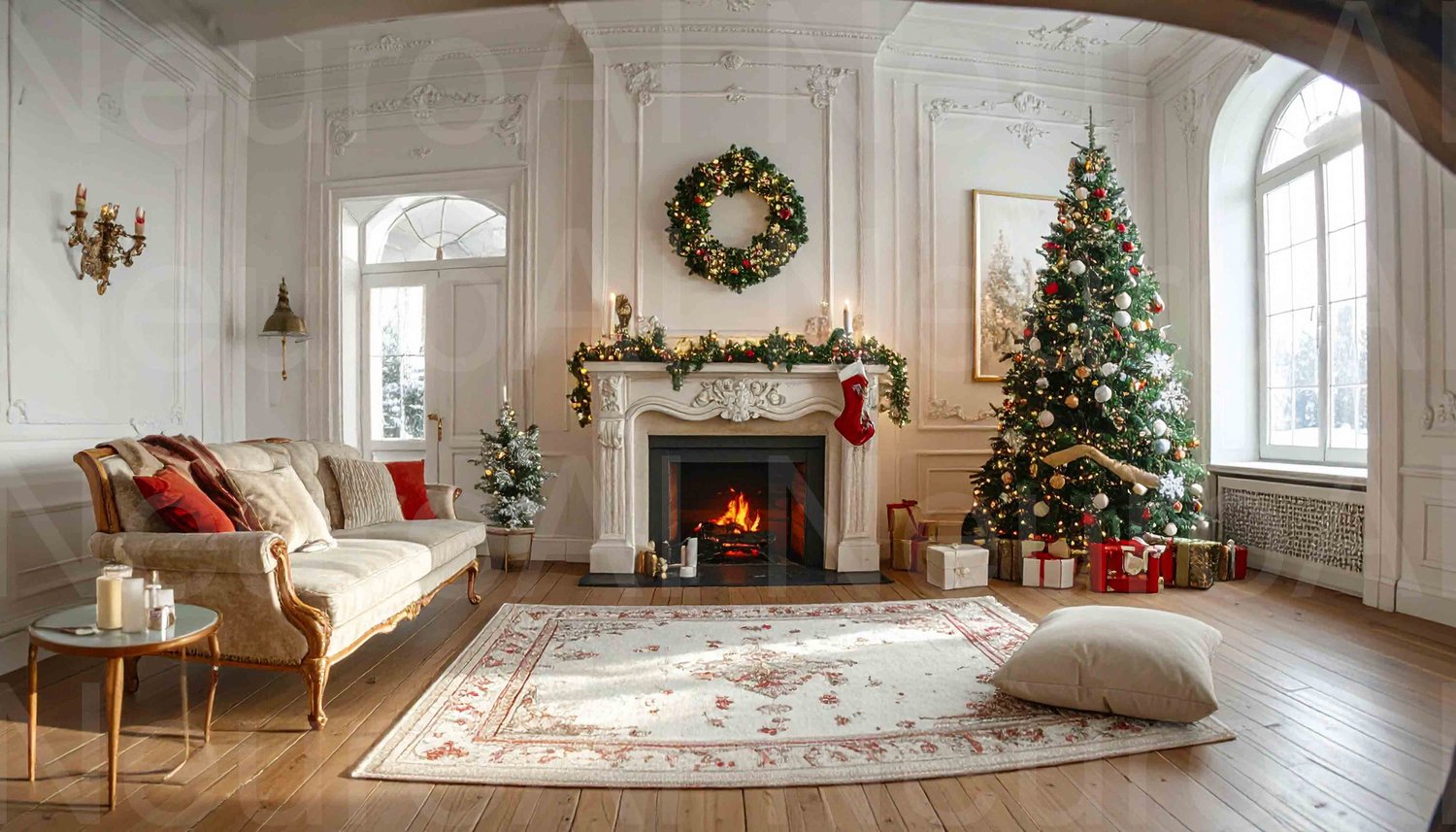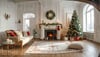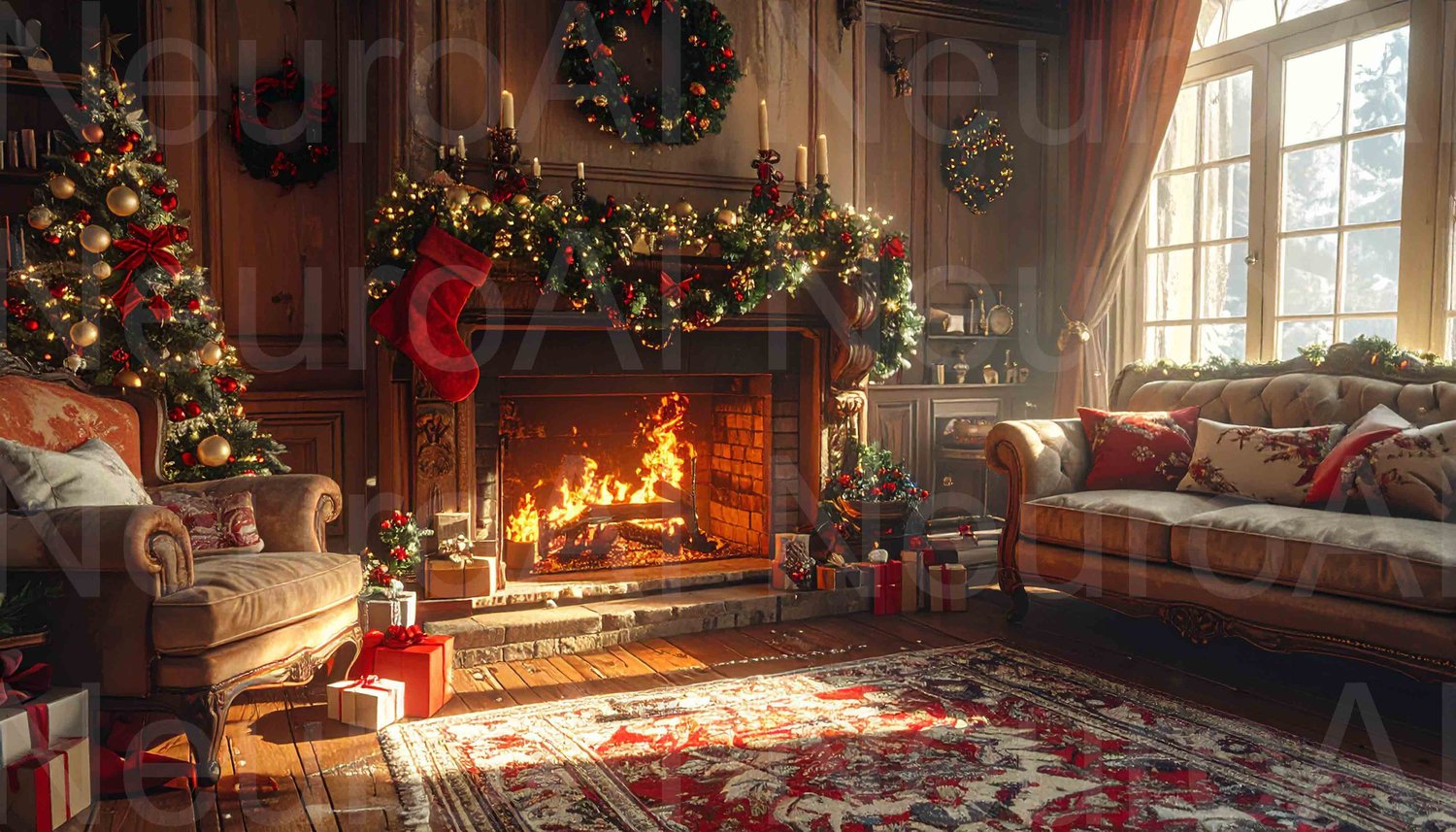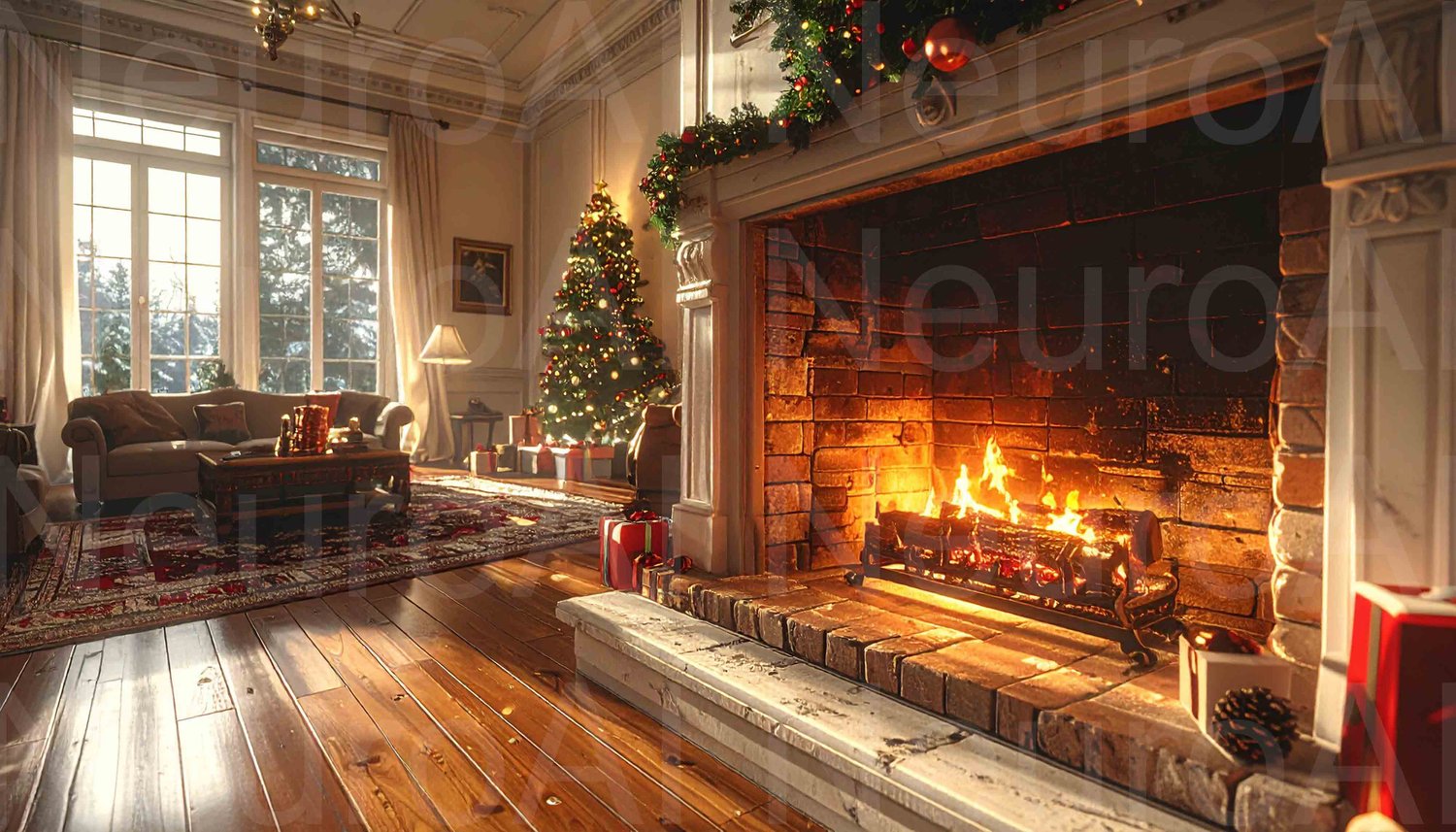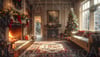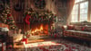 Cozy Christmas living room with roaring fireplace
