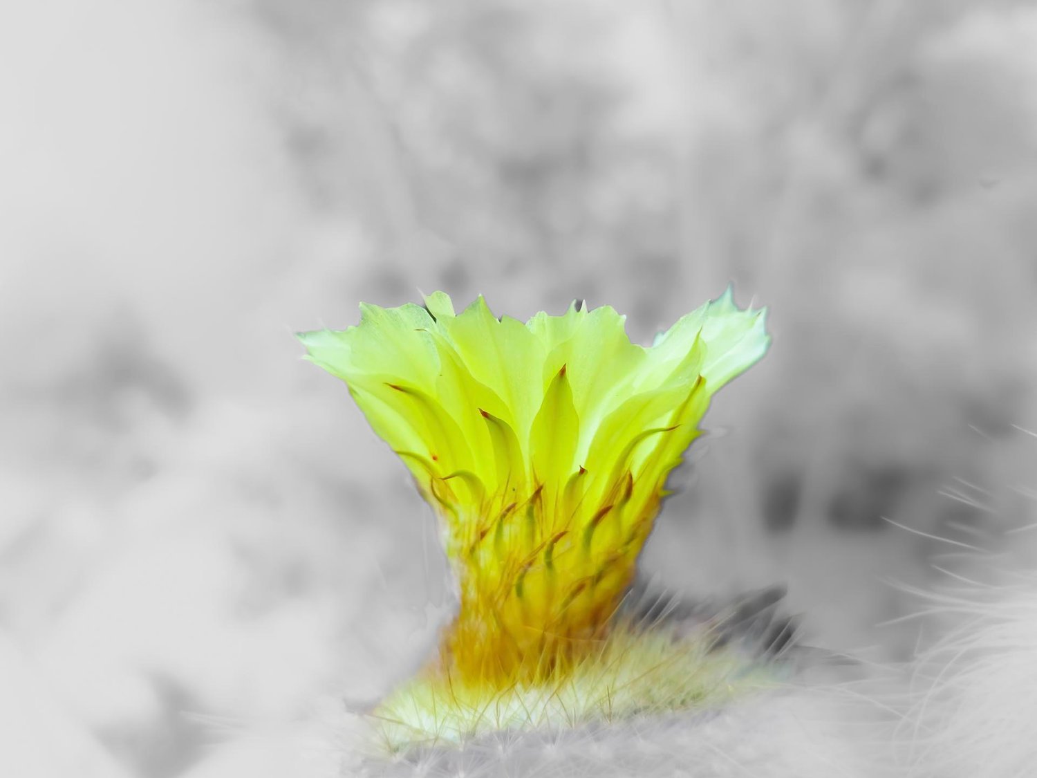 Close-up of a yellow cactus flower. These flowers are rarely seen because they only last a couple of days. They open early in the morning without warning and close at night. The second day they are no longer as fresh as the first and they usually do not open again and fall dry after a few days. This photograph was taken on the first day of its flowering.