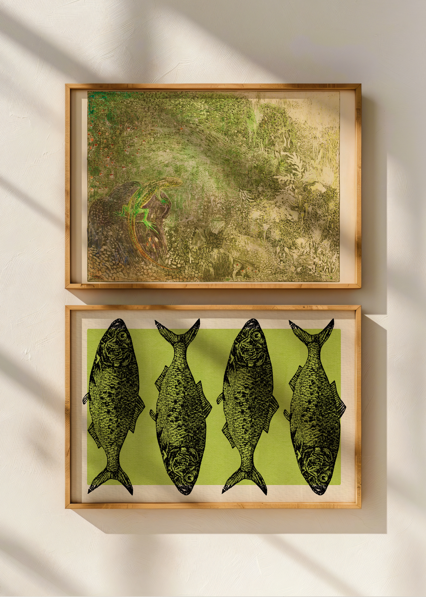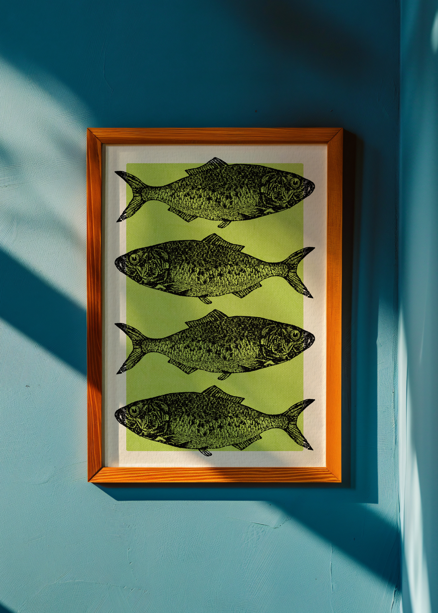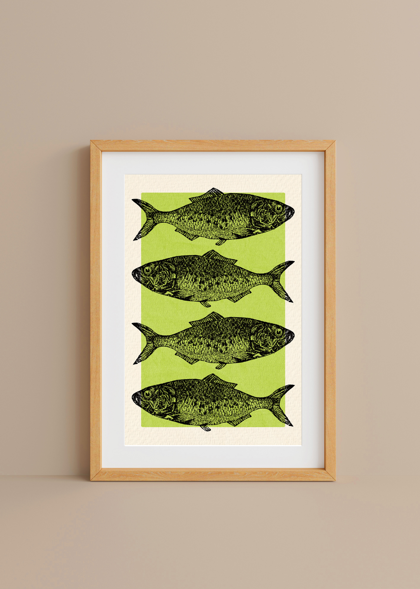 Green Fishes— Simple, clean, and slightly quirky, this print features four charming fish illustrations lined up vertically in sleek black. Against a soft green background with a white frame, it has a gallery wall feel with a touch of vintage science class charm. For ocean lovers, daydreamers, and collectors of oddities.