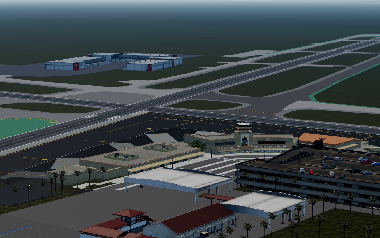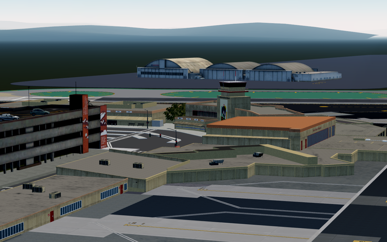 -Immersive scenery reflective of the airport's surrounding areas, including houses, hangars, and parking structures.