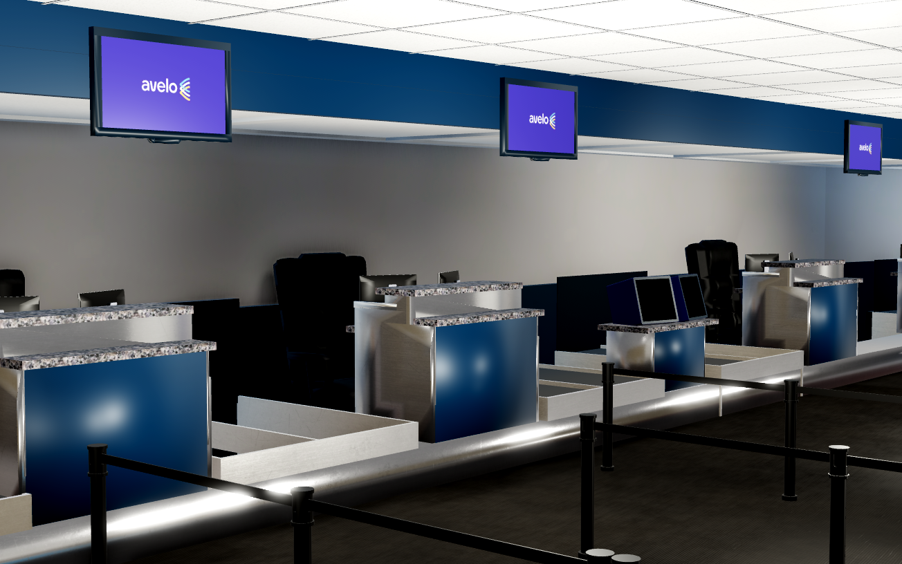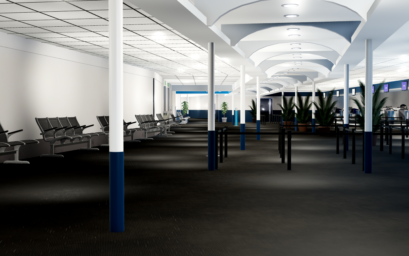 -Interior, including check-in, security, airport stores/restaurants, and gate areas.