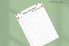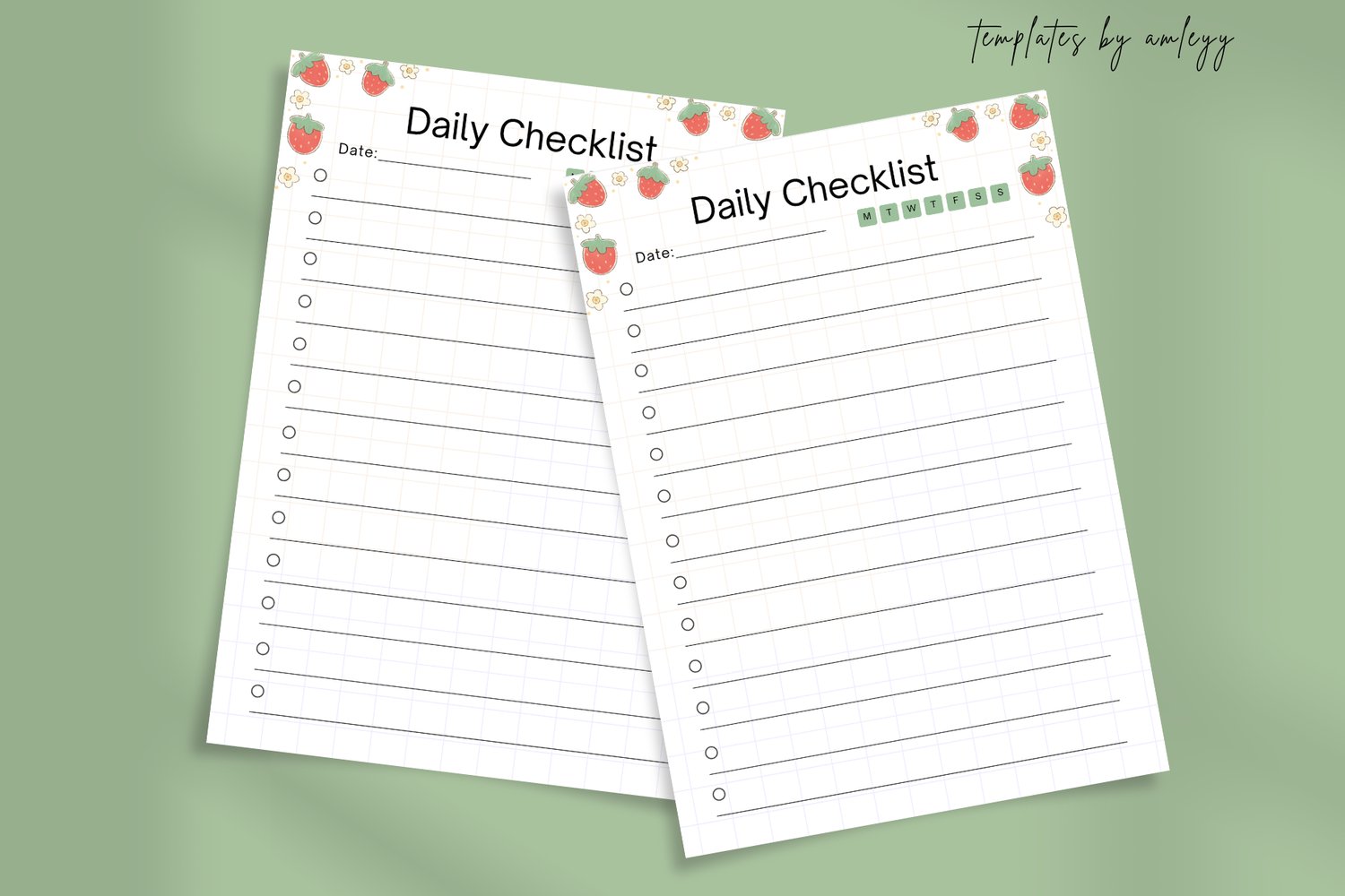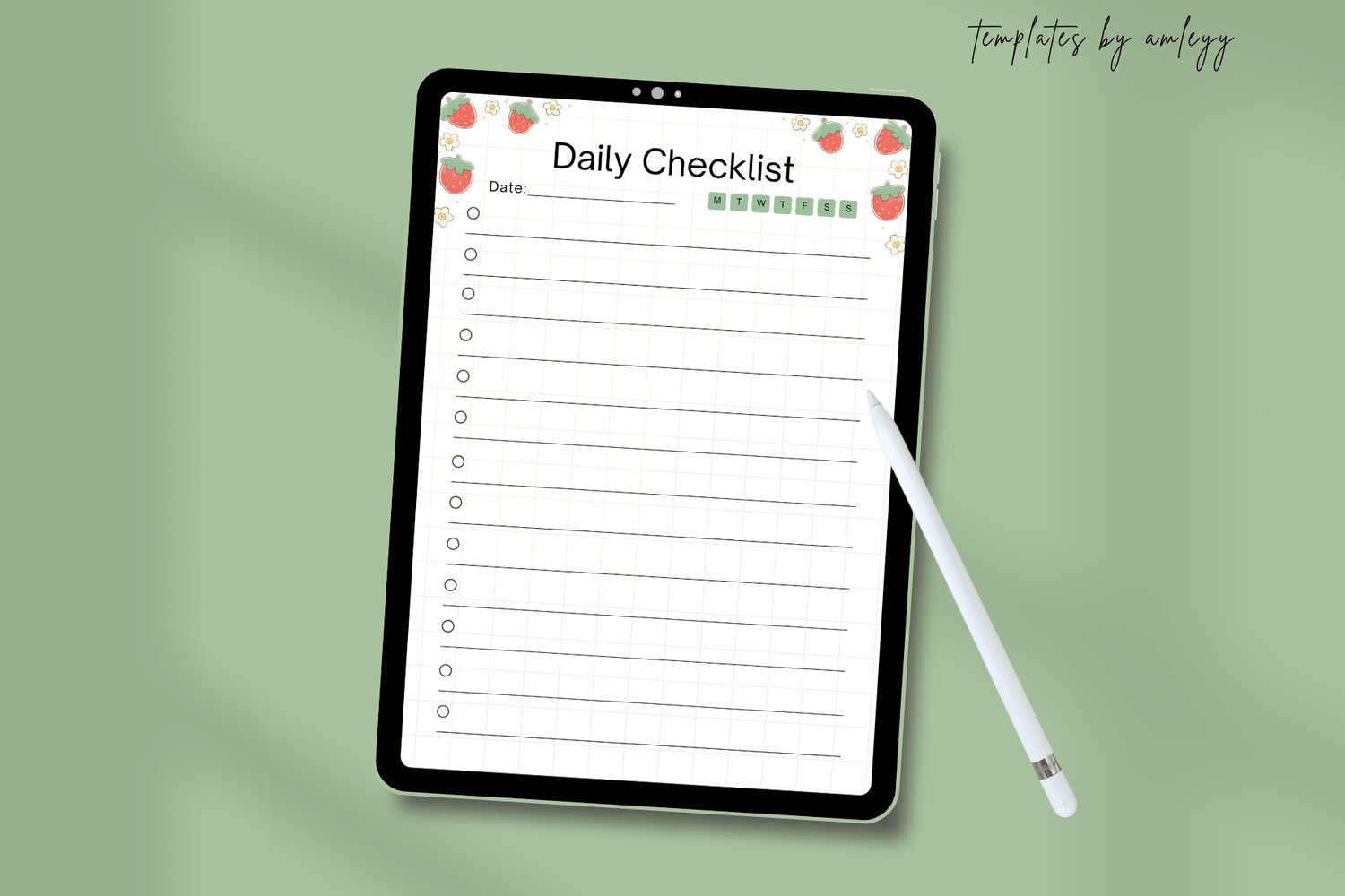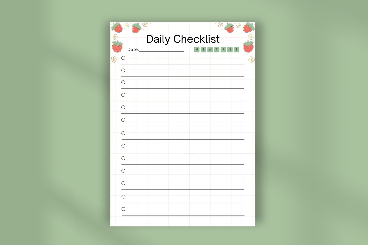 The template features a cute strawberry and subtle flower border at the top, adding a touch of whimsy to your daily planning routine. The main body of the checklist utilizes a clean grid background and lined spaces for writing, ensuring your list remains neat and easy to read.