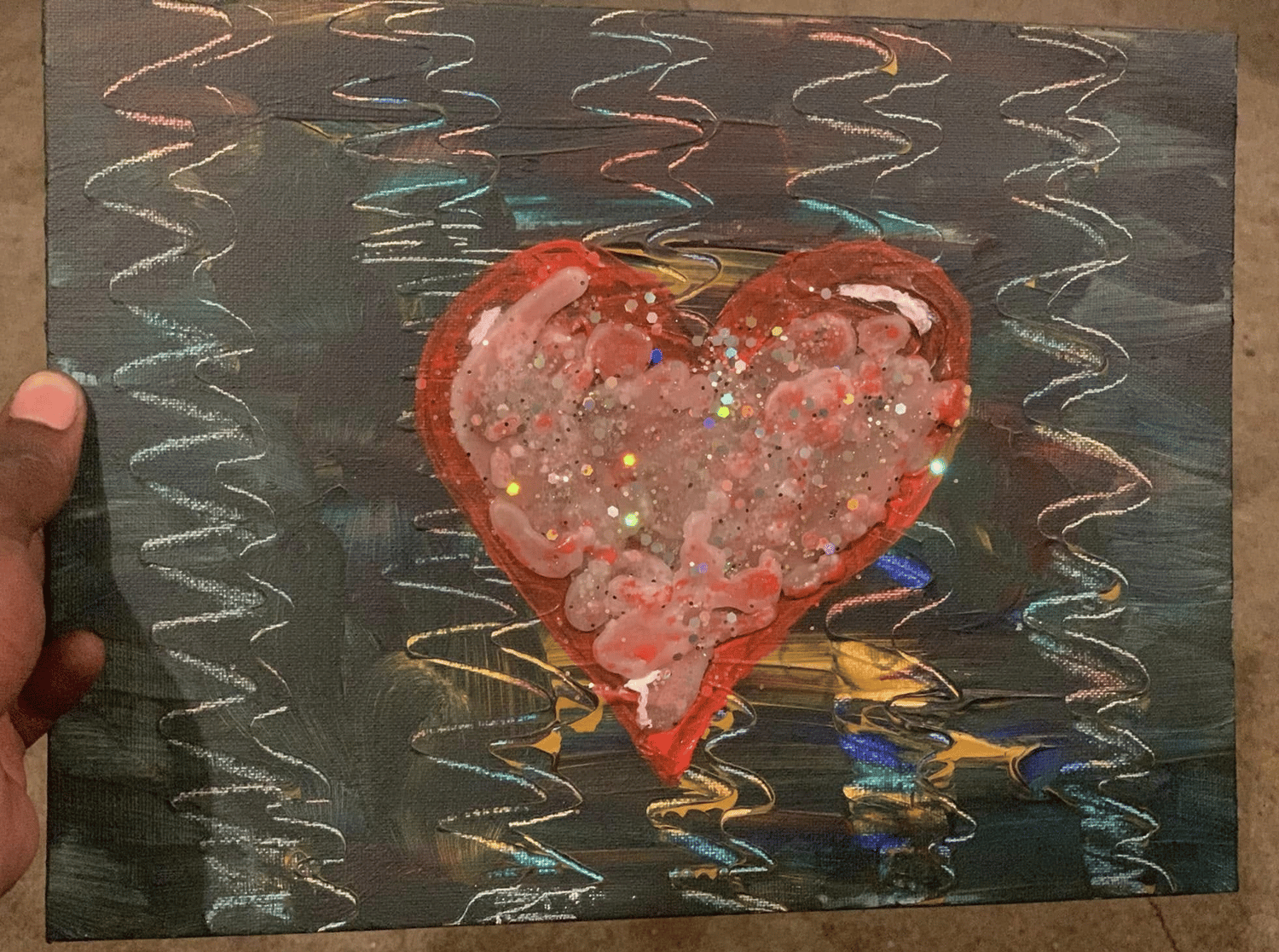 This digital painting showcases a central heart with a subtle shimmer and intriguing textures, contrasted by a dynamic and colorful backdrop. A unique and eye-catching representation of affection.