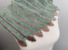 The impetus for this design was the stitch pattern that forms its decorative edge. Its resemblance to a lotus led me to research the plant and to learn that it is one of a small number of flowering plants that disperse their pollen through water, a process called hydrophily.