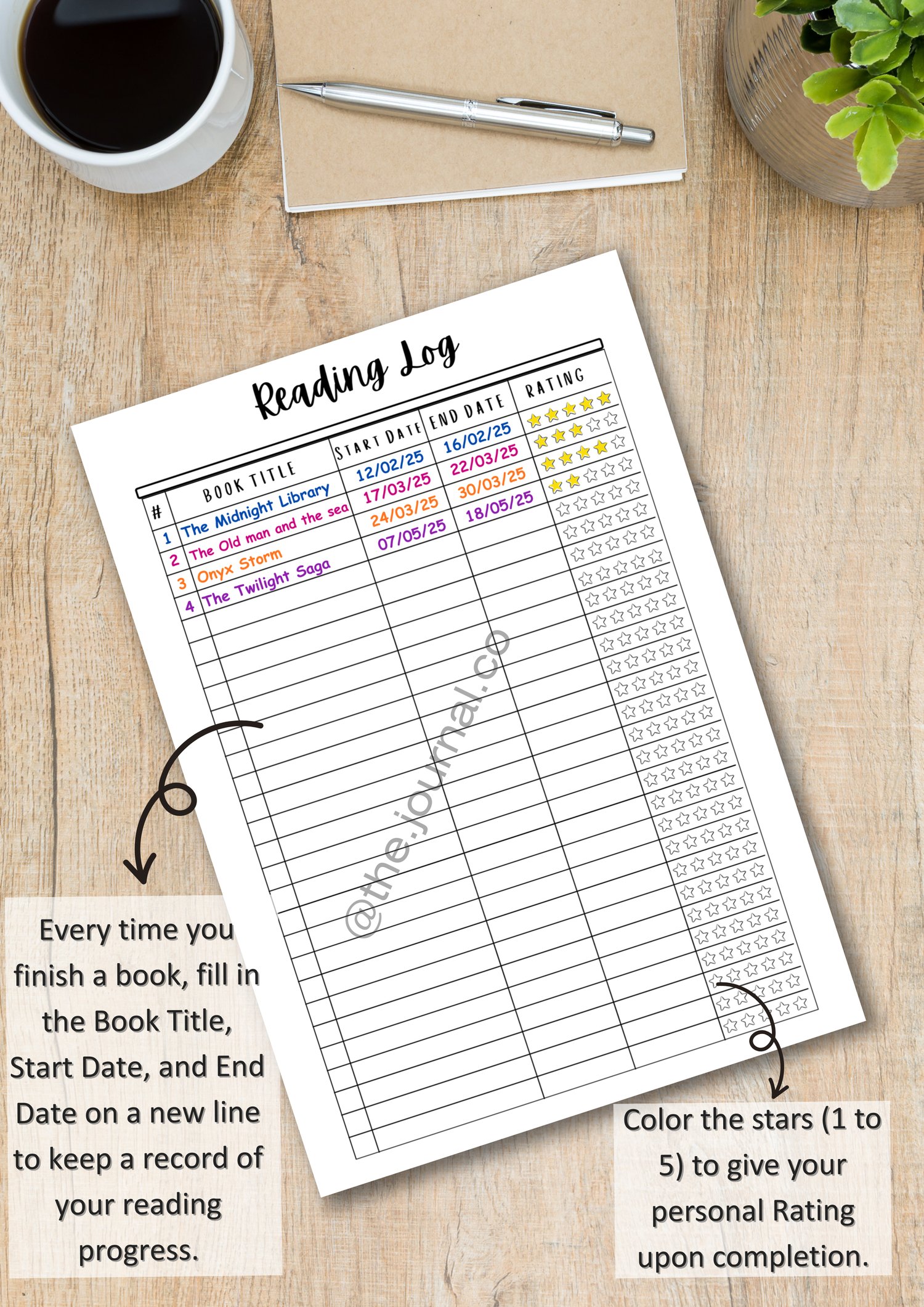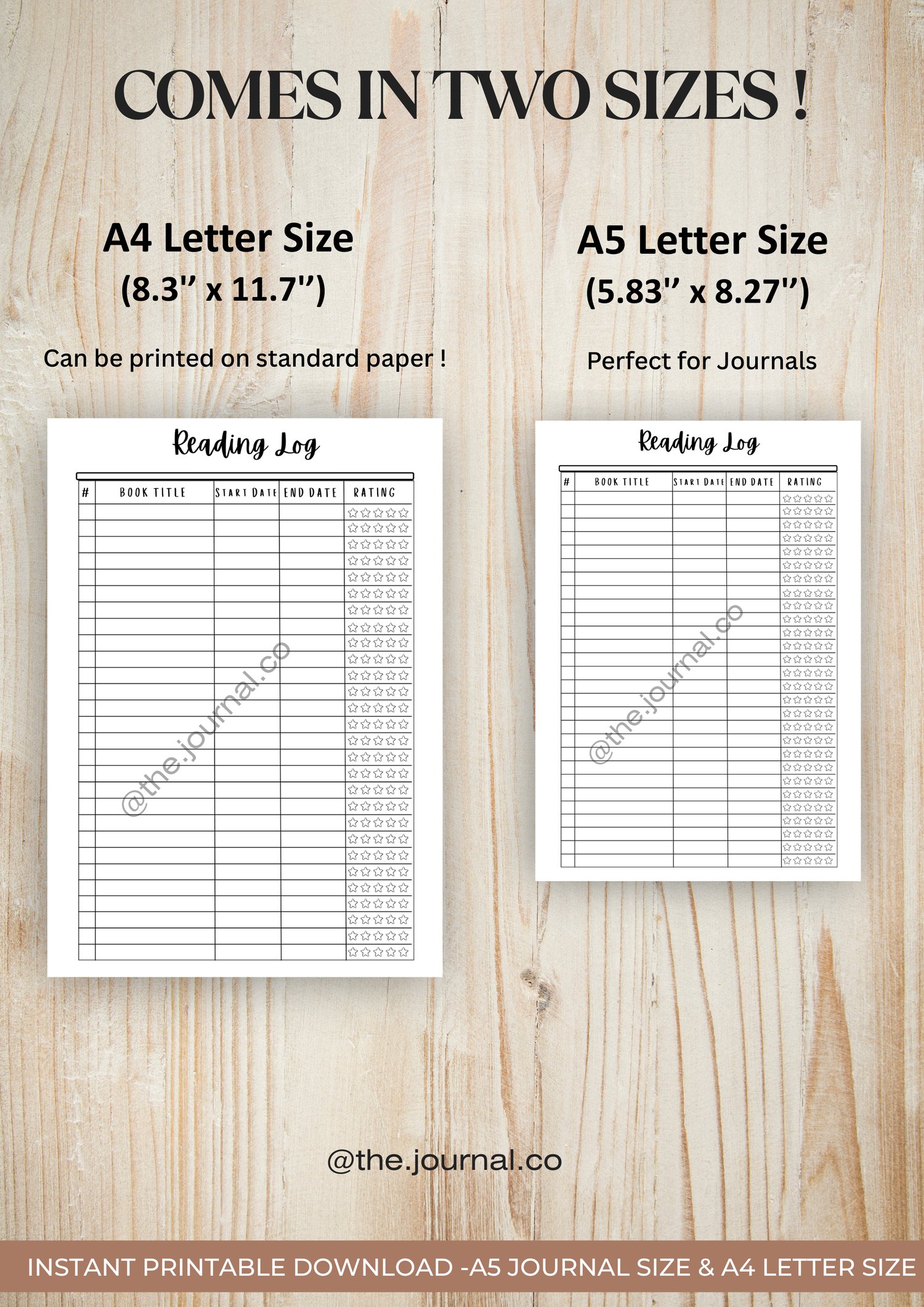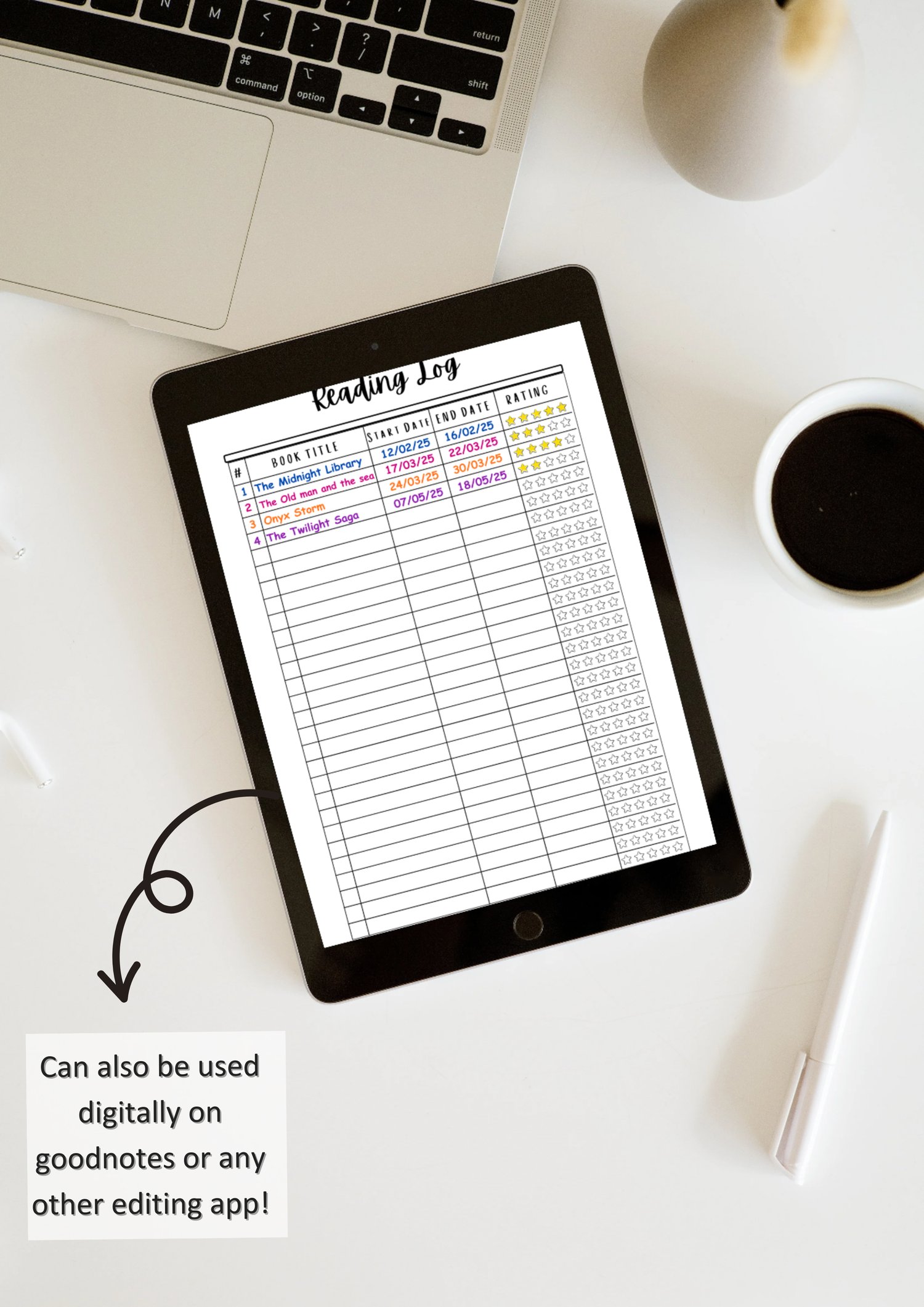 Keep a neat, organized record of your finished books with this Reading Log! A simple, effective table format to document the book title, start date, end date, and give a personal five-star rating upon completion. Use in GoodNotes or print as many times as you like!