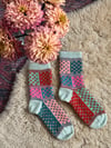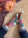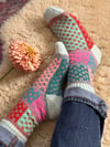Thulite Light socks are worked from the top down in allover stranded colorwork, with large, bold blocks of color on the front and back. The background color changes once per side, which creates a dramatic patchwork effect when viewed from the side. The socks also feature half-twisted ribbing and a mock short-row heel.