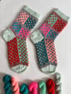 These socks are great for using scrap yarn. A coloring sheet is included in this pattern for you to try out different color combinations and play around!