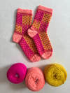 Samples are shown in Size 2 in Kelbourne Woolens Perennial (497 yds [454 meters] / 100 grams; 60% superwash Merino, 25% Suri alpaca, 15% nylon). Sample 1 (3-color version) used Cantaloupe (yarn A), Pineapple (yarn B), and Neon Pink (yarn C). Sample 1 is knit with yarn B held dominant throughout all colorwork sections. Sample 2 (7-color version) used Sea Spray, Pastel Green, Caribbean, Teal Green, Cantaloupe, Neon Coral, and Vermillion. For Sample 2 I switched the color placement on my second sock.