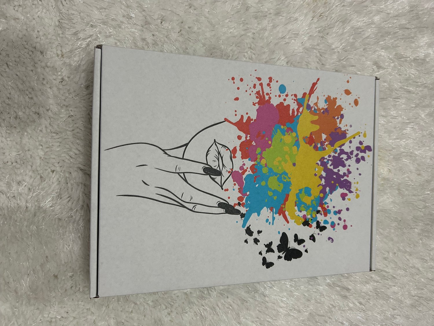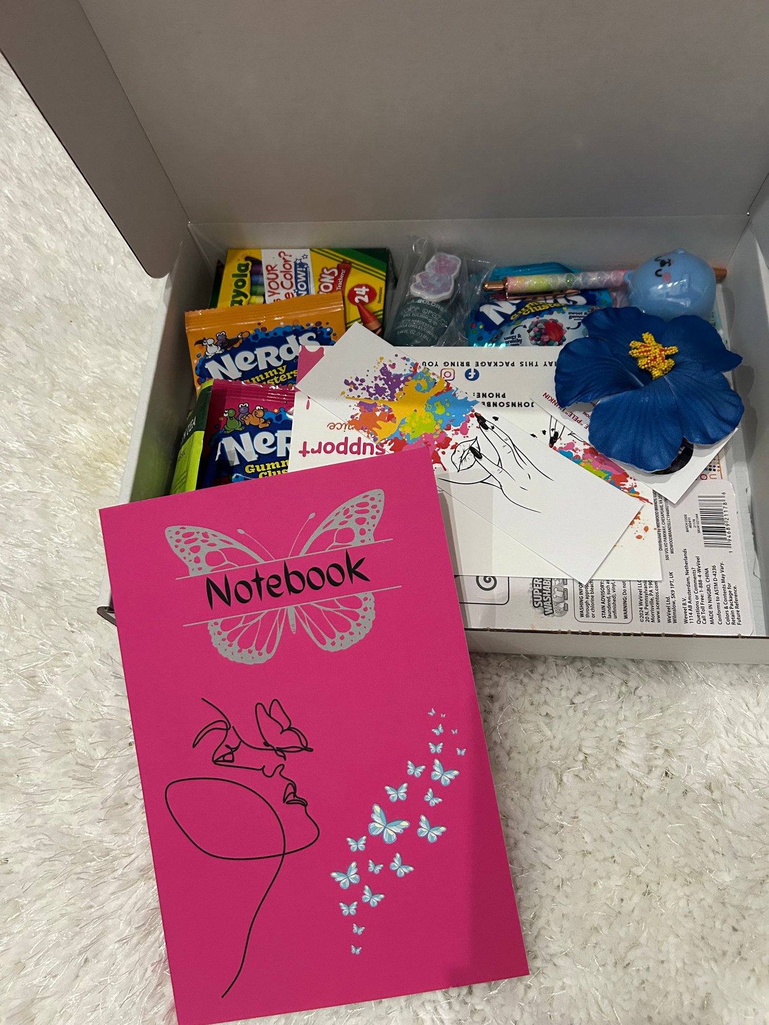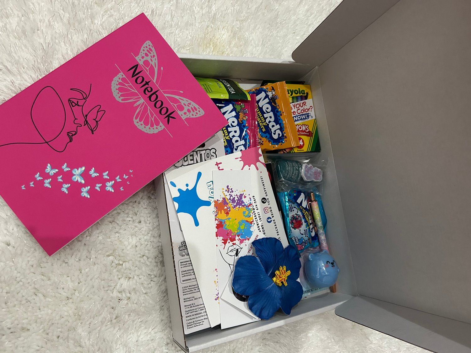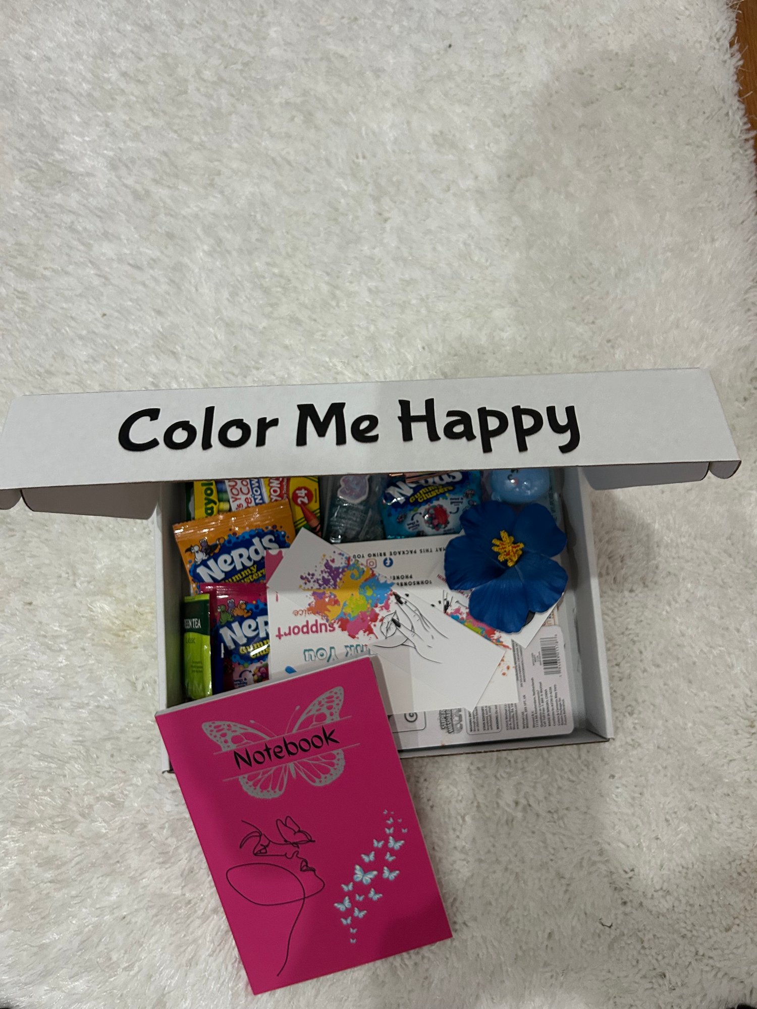 To add a touch of flair, there's a pack of trendy nail strips or nail polish for a quick and stylish makeover, along with a delicate hibiscus flower that symbolizes beauty and tranquility. The "Color Me Happy Treasure Box" is your perfect companion for fostering positivity, happiness and creativity in your everyday life.