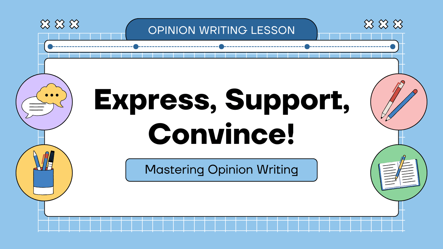 Here is your ready to teach presentation slides complete with 3 bonus templates for activities. Your students can enhance their opinion writing skills by expressing, supporting, and persuading others with their viewpoints. They discover their writing voice through guided activities, research, and creating opinion posters on chosen topics.