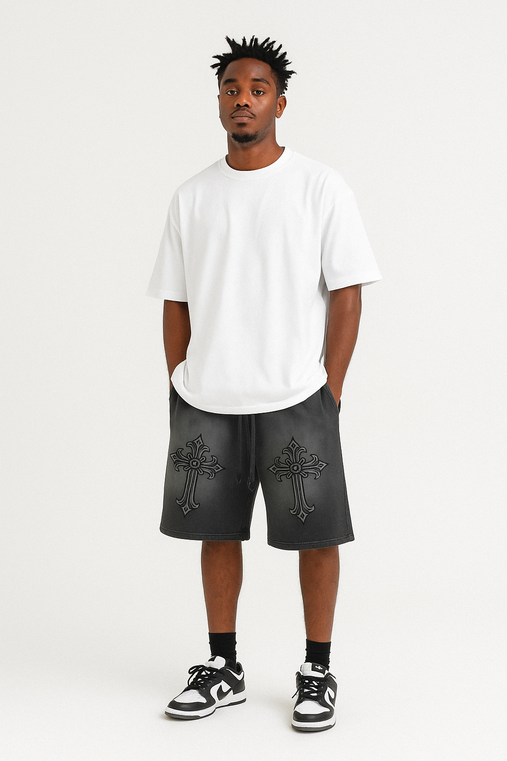 Edgy black streetwear shorts featuring bold embroidered gothic cross designs. Comfortable fit with drawstring waist – perfect blend of style and attitude.”
