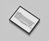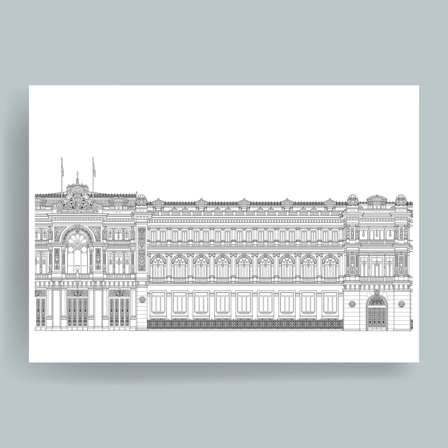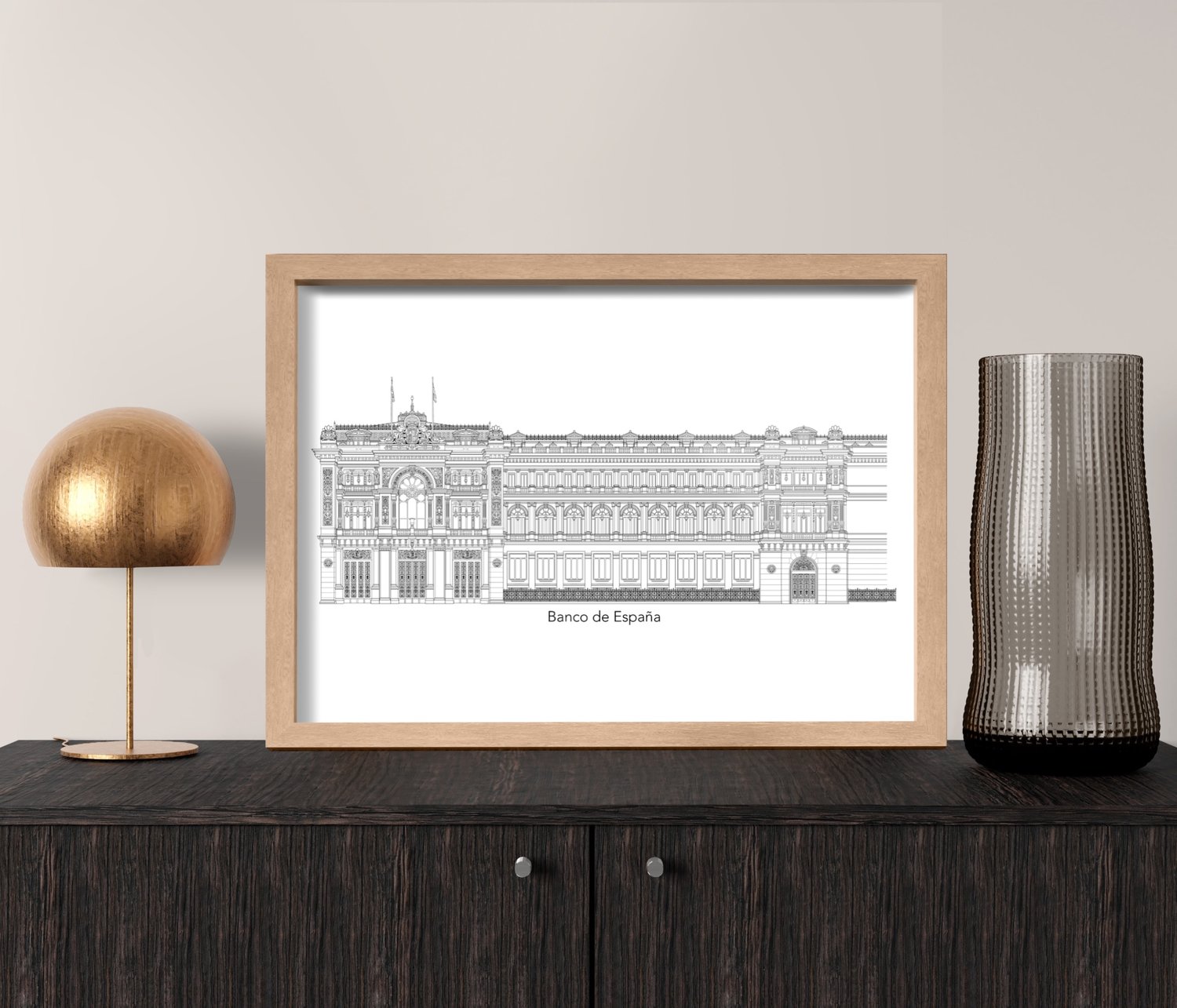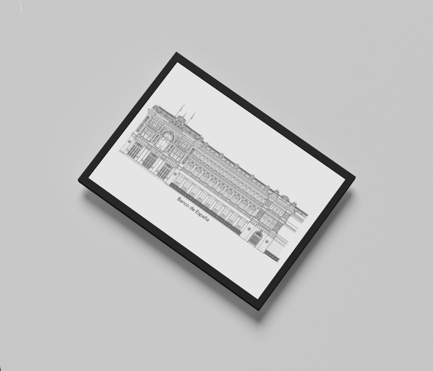 Versión ilustrada del Banco de España, centrada en la mitad de su fachada neoclásica. Trazos precisos resaltan columnas y ventanales, mostrando su escala monumental con un enfoque minimalista.