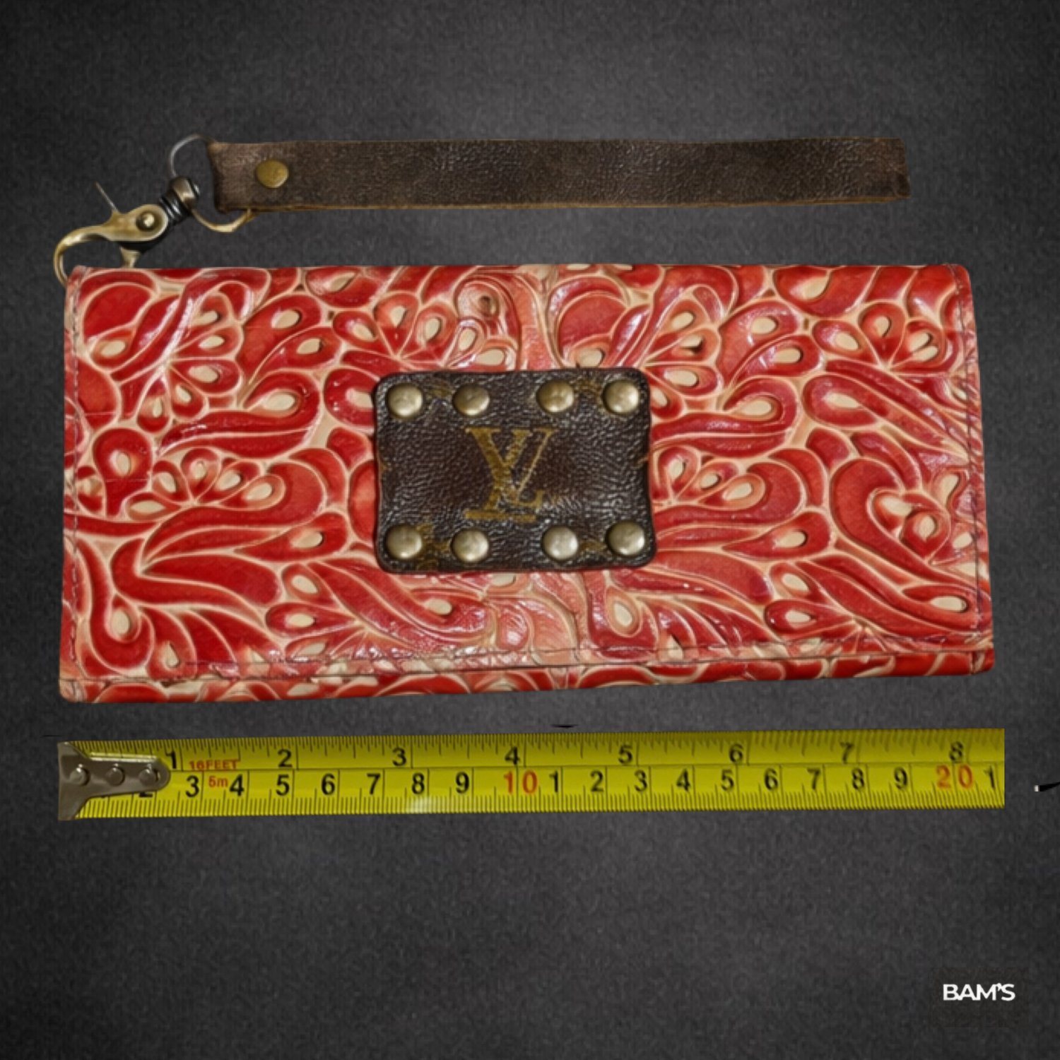 Upcycled Wallet w/ Authentic Louis Vuitton LV Patch Red Tooled Leather