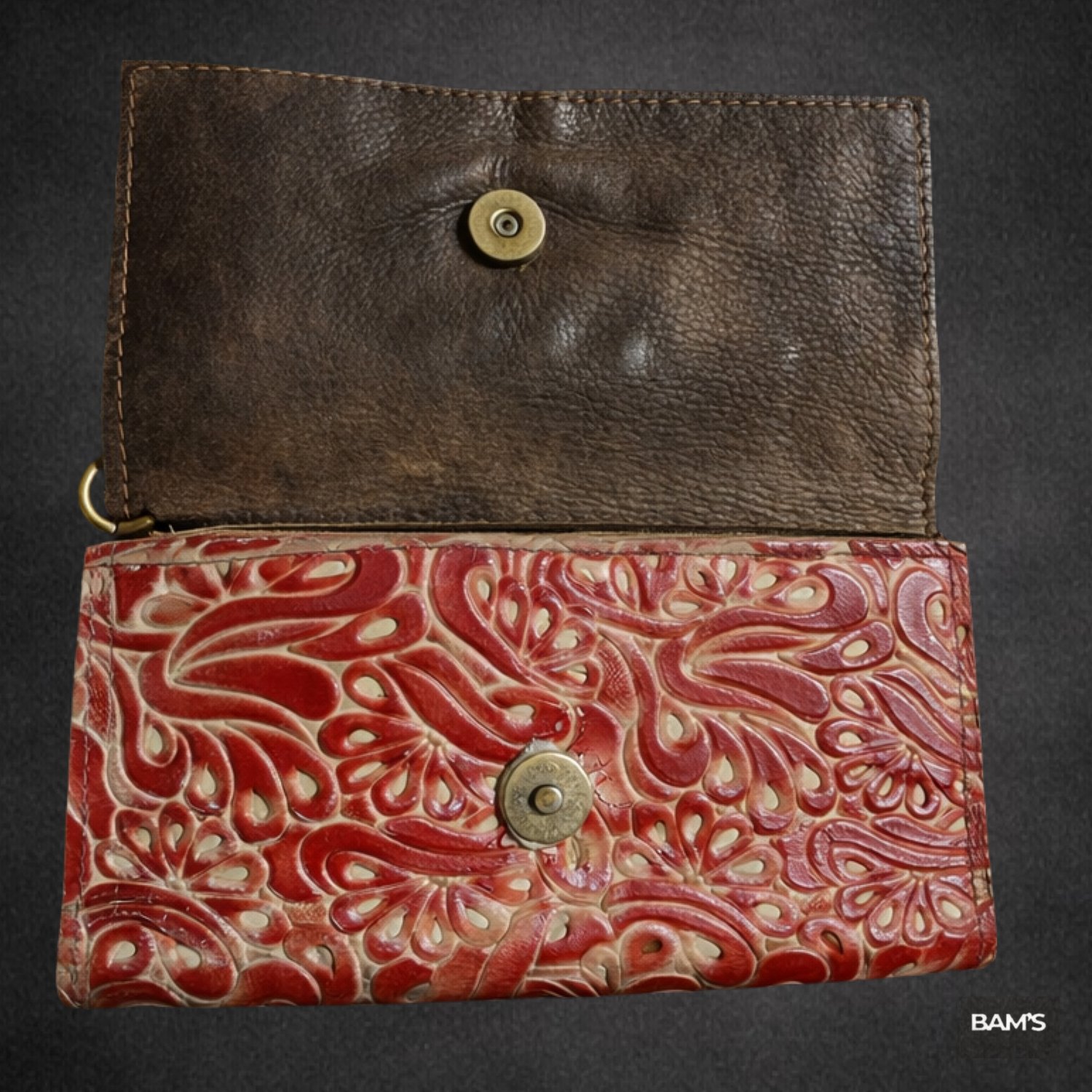 The wallet features a bold red tooled leather exterior with cream detailing, antique brass rivets, and a snap-closure flap. Interior is brown leather with a roomy compartment for cards, cash, or phone essentials. Includes a detachable wrist strap for easy carry.