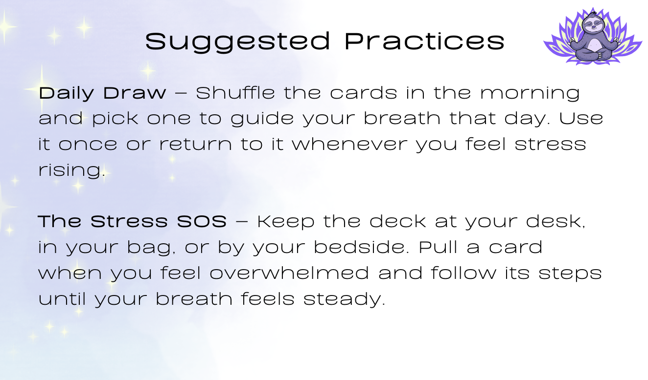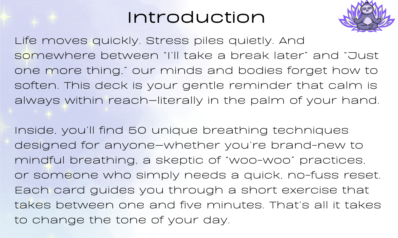 Breathe Reset Deck is your pocket-sized invitation to slow down, soften, and reconnect with yourself. This downloadable deck offers fifty unique, one-to-five-minute breathing exercises designed to melt tension, quiet mental noise, and bring you back to the present moment. Whether you’re new to mindful breathing, skeptical about meditation, or simply craving a quick and effective way to reset, each card offers an easy-to-follow practice you can do anywhere—at your desk, in the car, between errands, or before bed.