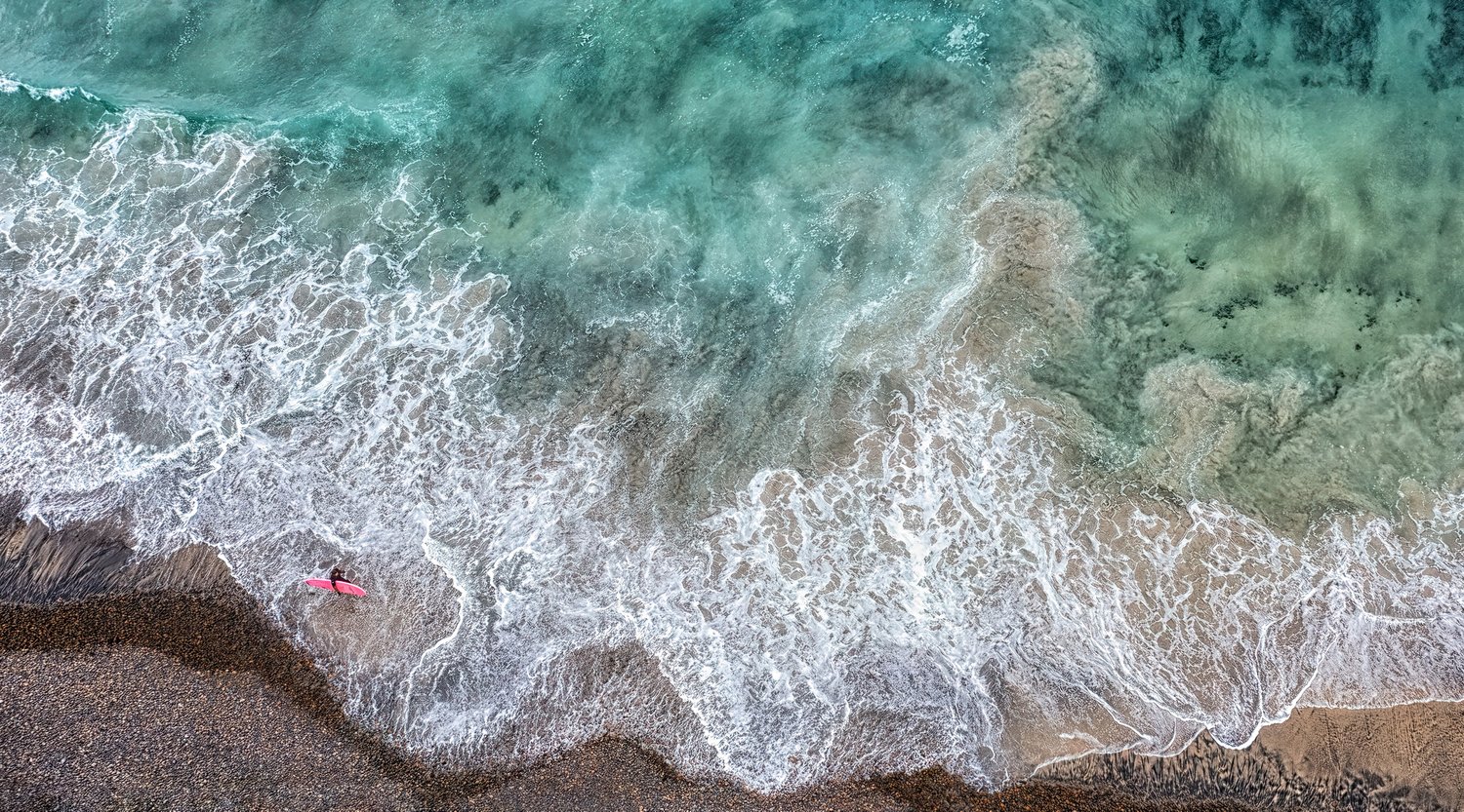- Notes from the Artist: This image stirs me to remember why I fell in love with photography. When I decided to purchase a drone, I made a goal to attempt to fly it in all 50 states and as many counties as possible. In California, in the company of my husband and best friend, I was searching for areas where I could legally use the drone and finding it very challenging. Finally, just as I was about to give up, I found this spot on the beach. While flying the drone over this stretch of coastline, a surfer with a pink board got out of the water, calling it a day and began to walk up the shore! It was the perfect moment of capture. I knew it would be one of my favorite images. This image is so meaningful to me. It is a reminder that patience, persistence, and a little bit of luck often lead to the most magical of shots, and that adventures are even sweeter when shared with the people you love.