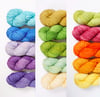 LOL is a boomerang shawl with simple textured stitches. Use your favorite tonal color to create your own LOL. This was made with Dirty Water Dyeworks Lillian in “Depression Glass” (single skein) and Heliotrope (2 skeins.) Choose your favorite color - she has many beautiful colors to choose from (see left.)