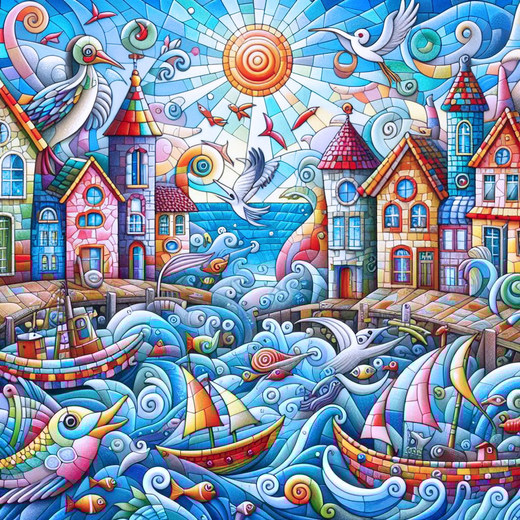 A whimsical world. A seaside village of quirky houses made of mosaics, looking across at blue sea where whimsical boats ride on curly waves, Fish leap high out of the water, and a pelican scoops a fish into its mouth.