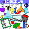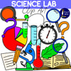 Contains: bar graph, battery, beaker, bond, clip board, DNA helix, DNA strand, dropper, three flasks, eye, goggles, leaf, light bulb, magnet, magnifying glass, leaf magnified, measuring tape, microscope, note taking, open book, two question marks, speech bubble, stop watch, two test tubes, thermometer.