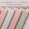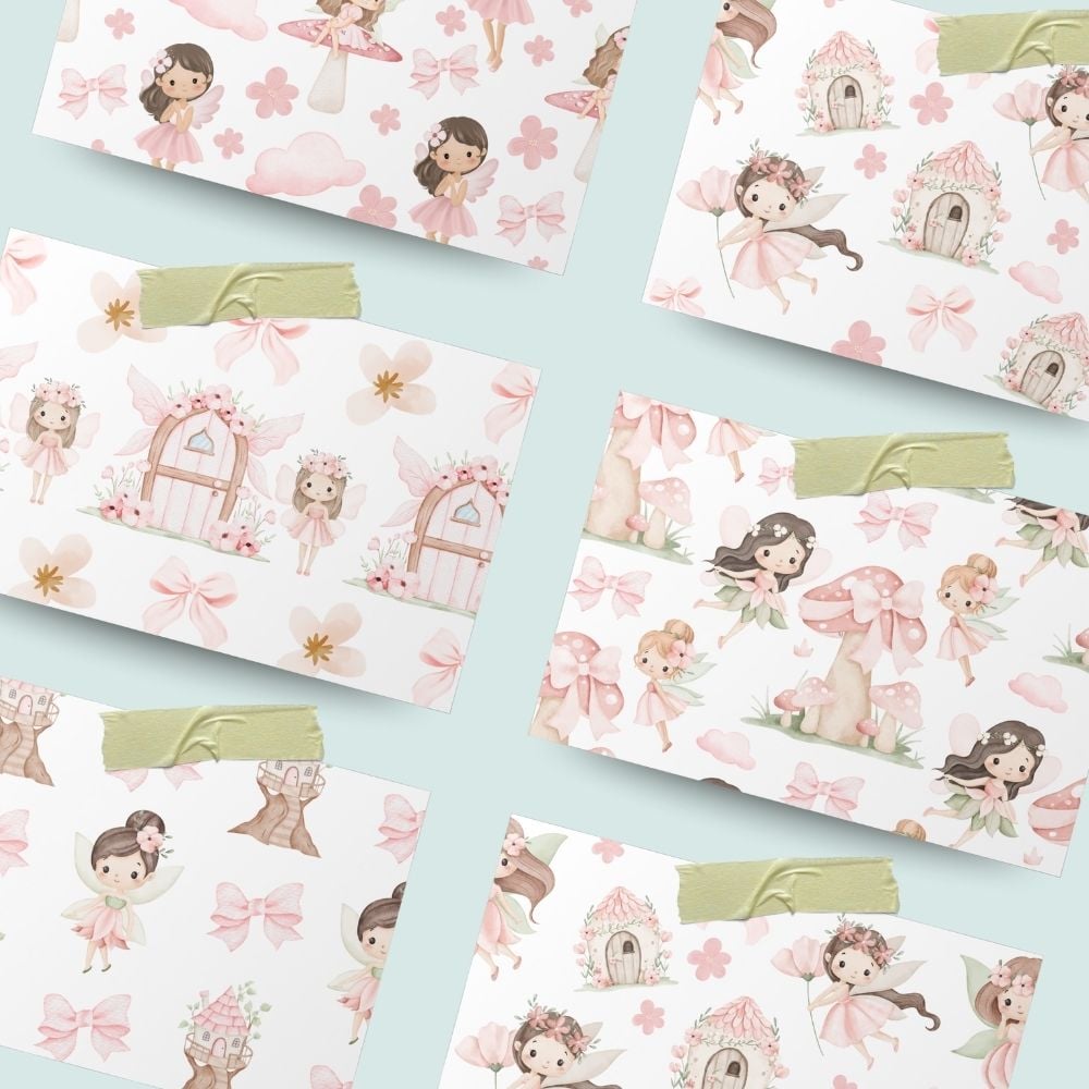 Unlock a magical world with this set of 16 whimsical fairy seamless patterns, perfect for children’s crafts, nursery decor, scrapbooking, invitations, and DIY projects. Each high-resolution design features adorable fairies, pastel castles, butterflies, bows, mushrooms, clouds, and floral cottages, all rendered in dreamy, soft colors to inspire creativity and wonder.