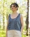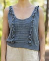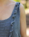 The simple front panel of the Jeansy Tank is bordered by two ruffle edges that the knitter can choose to leave unknitted if desired. The top is knitted top-down, making it easy to adjust the length. The design suits various body types.