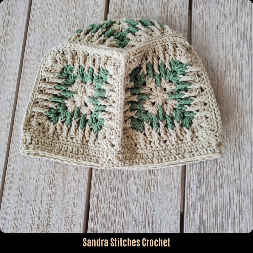 Featuring mosaic style granny square motifs in earthy tones of natural beige and leafy green.