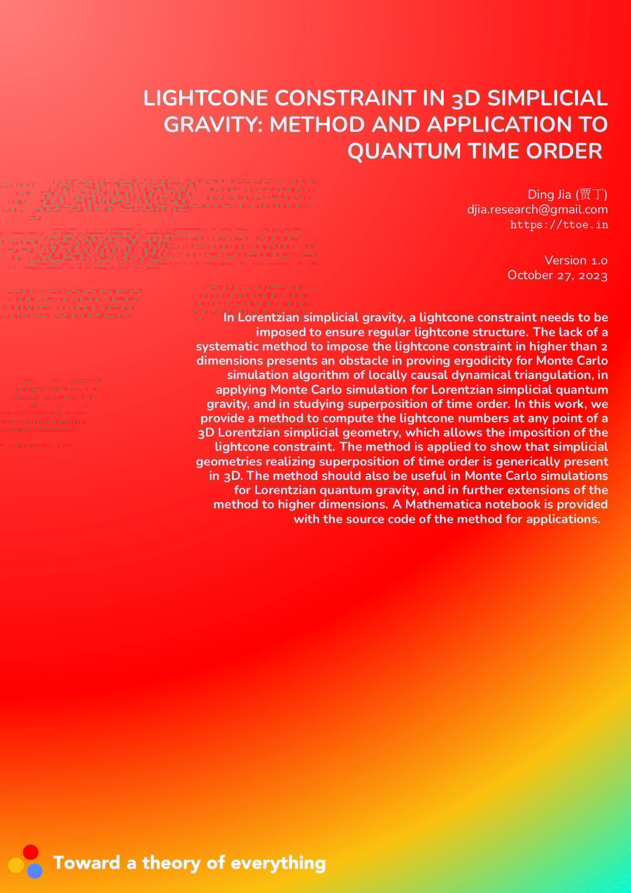 Abstract: In Lorentzian simplicial gravity, a lightcone constraint needs to be imposed to ensure regular lightcone structure. The lack of a systematic method to impose the lightcone constraint in higher than 2 dimensions presents an obstacle in proving ergodicity for Monte Carlo simulation algorithm of locally causal dynamical triangulation, in applying Monte Carlo simulation for Lorentzian simplicial quantum gravity, and in studying superposition of time order. In this work, we provide a method to compute the lightcone numbers at any point of a 3D Lorentzian simplicial geometry, which allows the imposition of the lightcone constraint. The method is applied to show that simplicial geometries realizing superposition of time order is generically present in 3D. The method should also be useful in Monte Carlo simulations for Lorentzian quantum gravity, and in further extensions of the method to higher dimensions. A Mathematica notebook is provided with the source code of the method for applications.