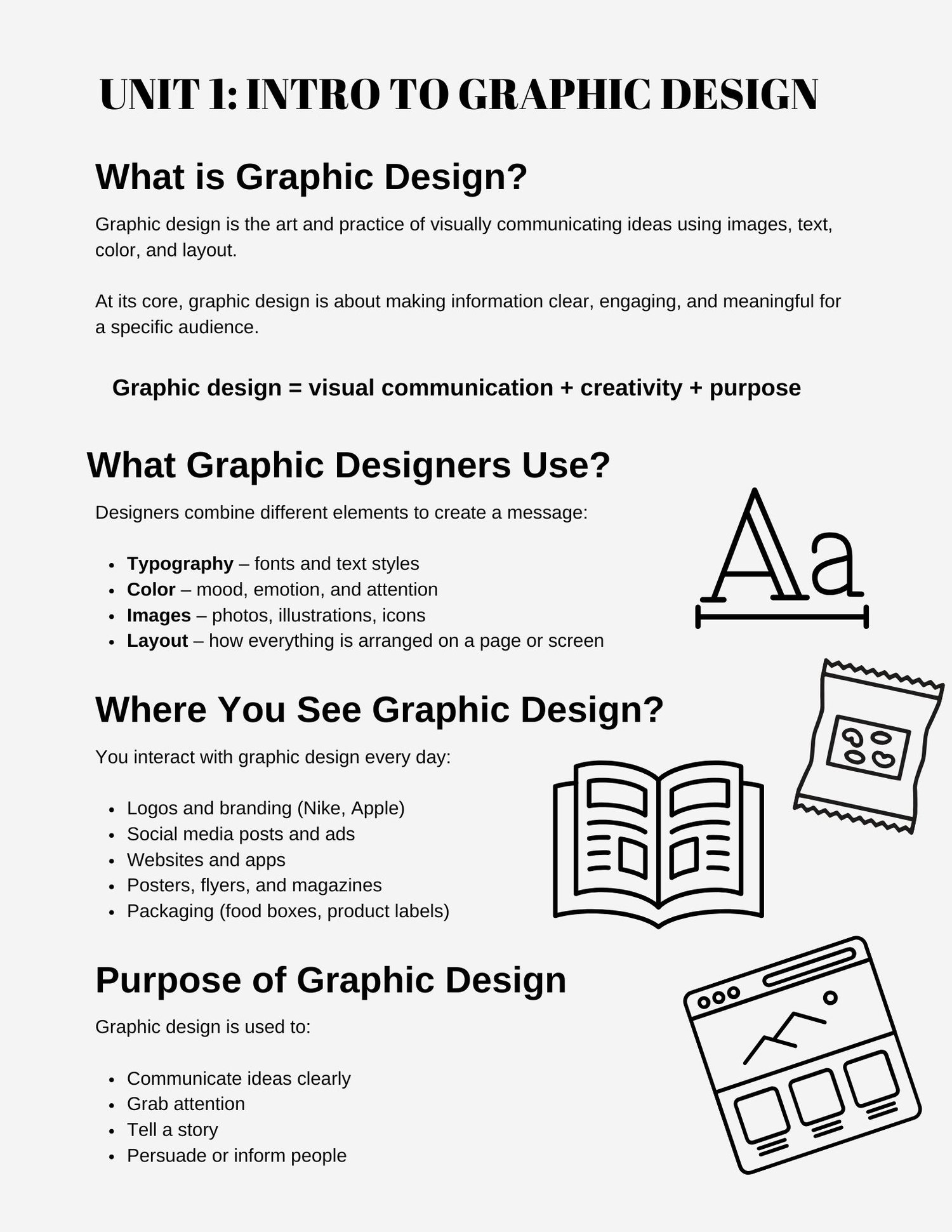 Students will discover what graphic design is, where it appears in everyday life, and how designers communicate ideas using basic elements like line, shape, color, and typography. This unit encourages observation, creativity, and critical thinking while building confidence in visual expression—no advanced drawing skills required!