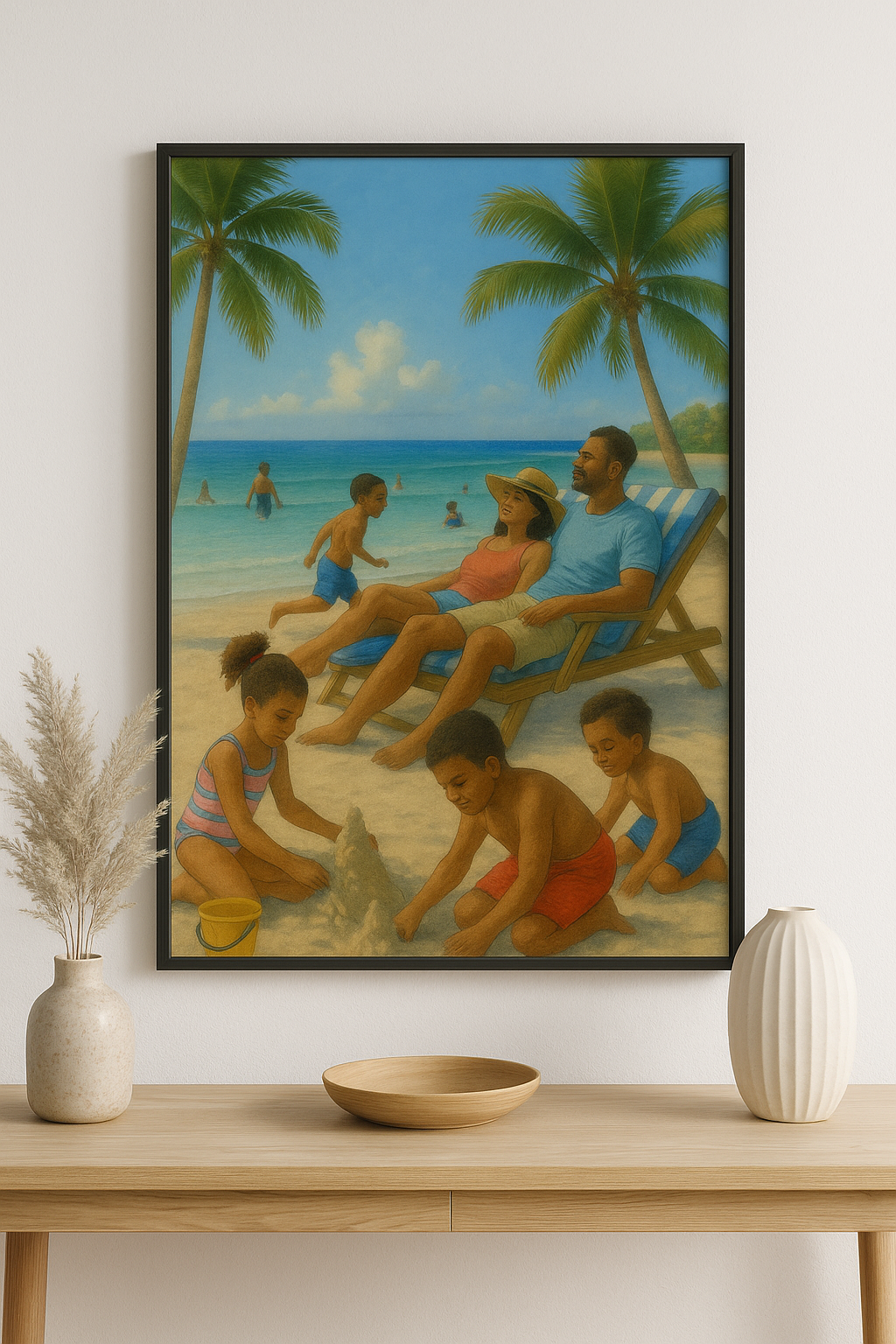 Capture the warmth of family and sunshine with Sun-Kissed Moments, a heartwarming beach day illustration that celebrates Black family joy and connection. Featuring parents lounging peacefully under palm trees as children play in the sand, this artwork radiates love, unity, and the carefree spirit of summer. Perfect for brightening up any home with positivity and pride.