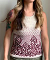 This fingering-weight colorwork tank is knit bottom-up in the round. It separates at the armholes and the front and back are knit flat, then seamed at the shoulders. Picked-up ribbed neckband and armhole edging.