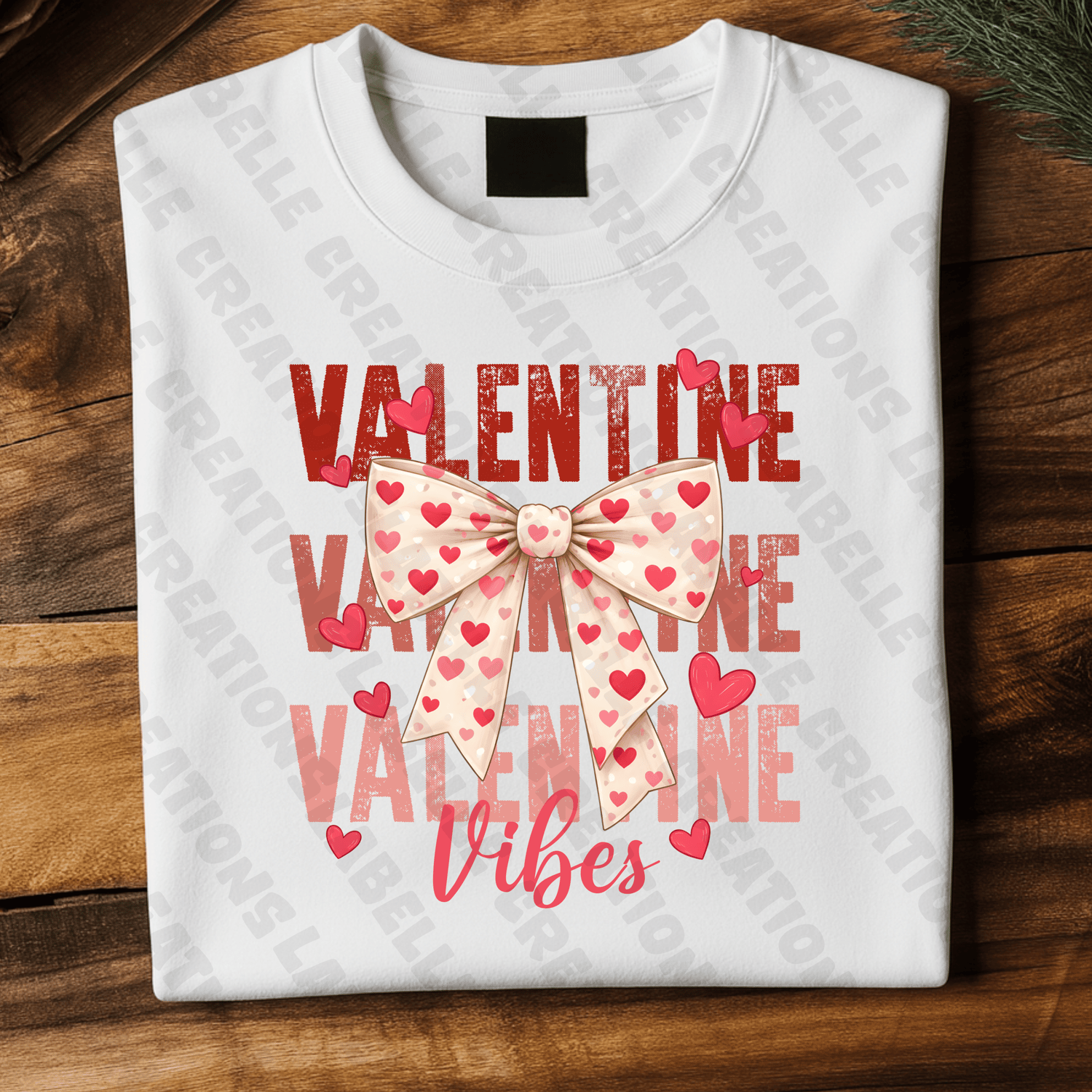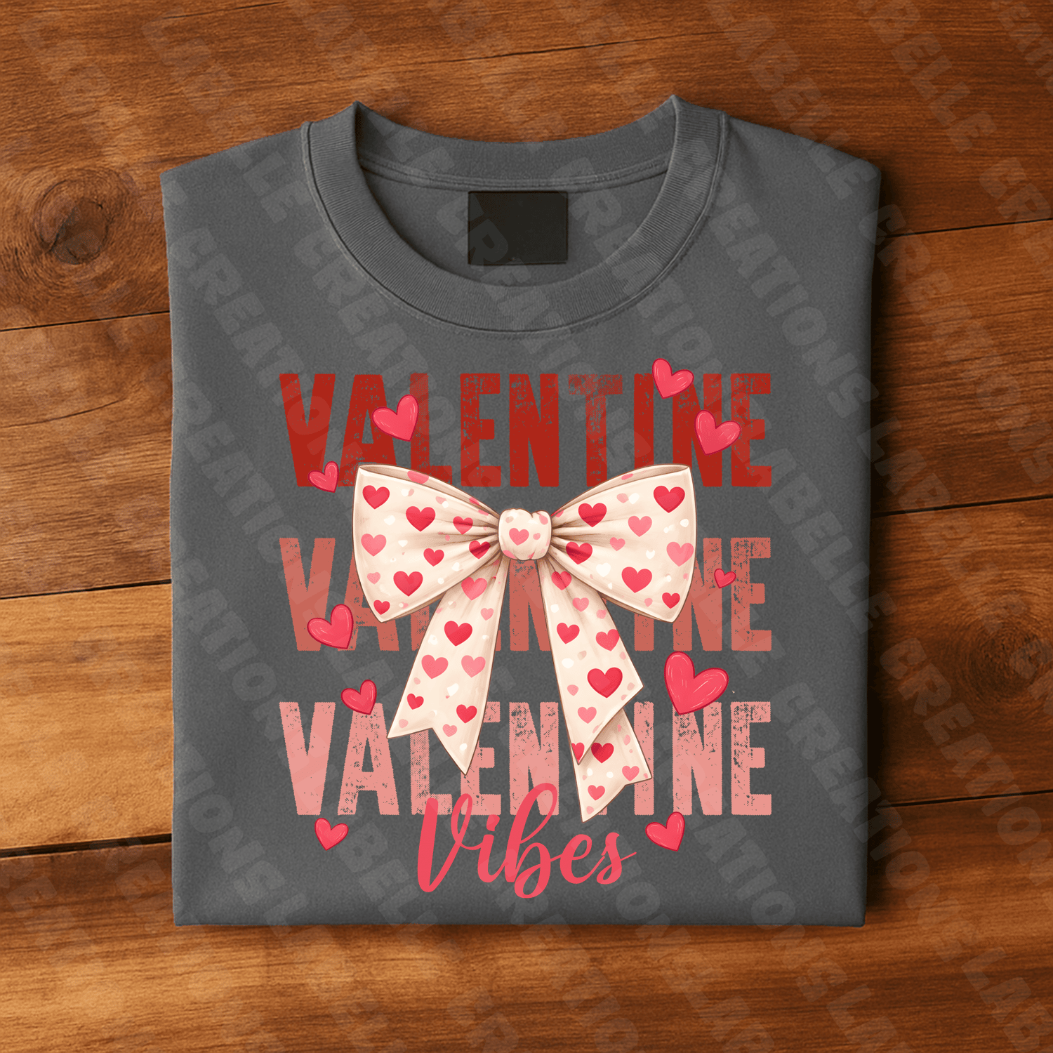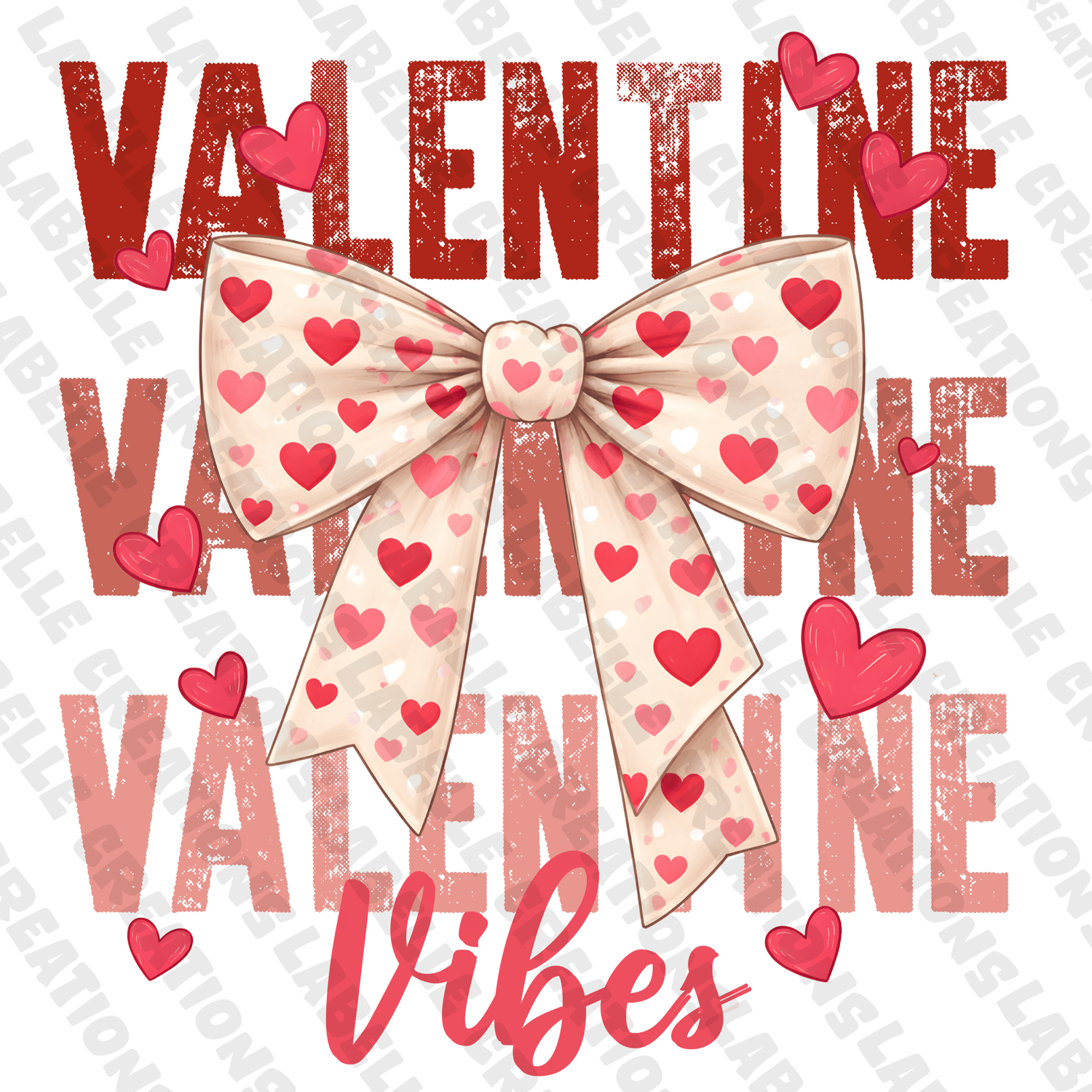 This adorable Valentine-themed digital design features a soft cream bow covered in pink and red hearts, surrounded by floating heart accents and layered over bold distressed lettering that reads “VALENTINE VIBES.” The overall aesthetic is sweet, trendy, and playful—perfect for Valentine collections and cozy romantic projects.