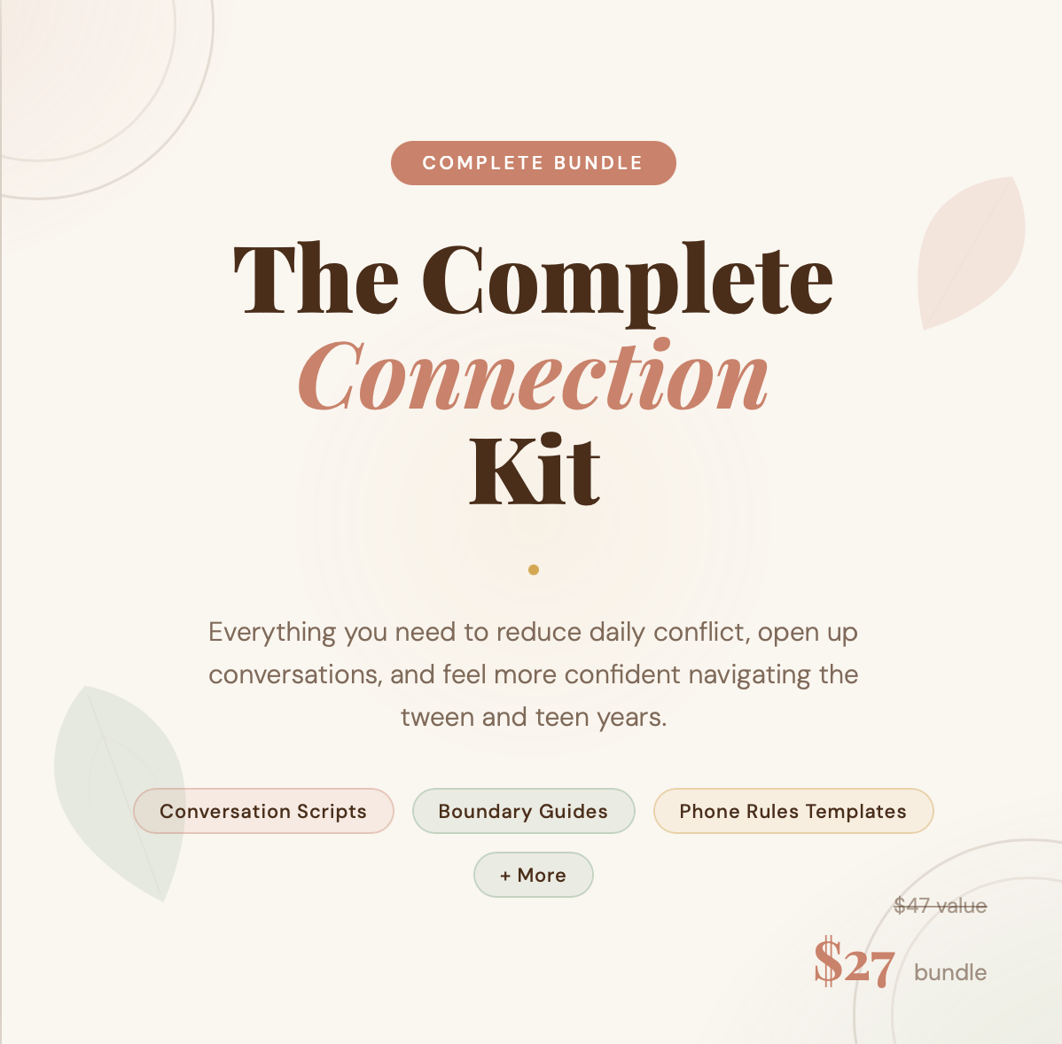 Parenting tweens and teens is one of the hardest chapters — especially when screens, social media, and growing independence are part of the mix every single day. This bundle gives you the practical tools to have the real conversations, set the right boundaries, and stay connected even when it feels like they're pulling away.