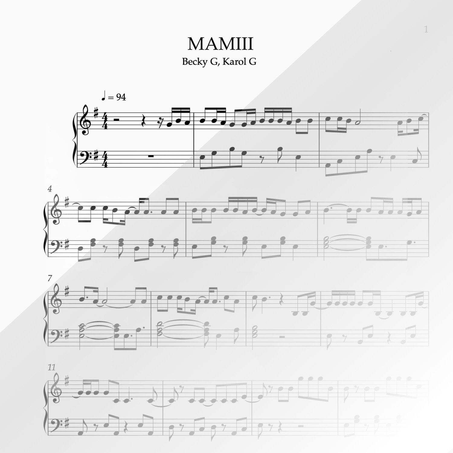 In the package you will receive sheet music "MAMIII - Becky G, KAROL G in PDF and JPEG formats.