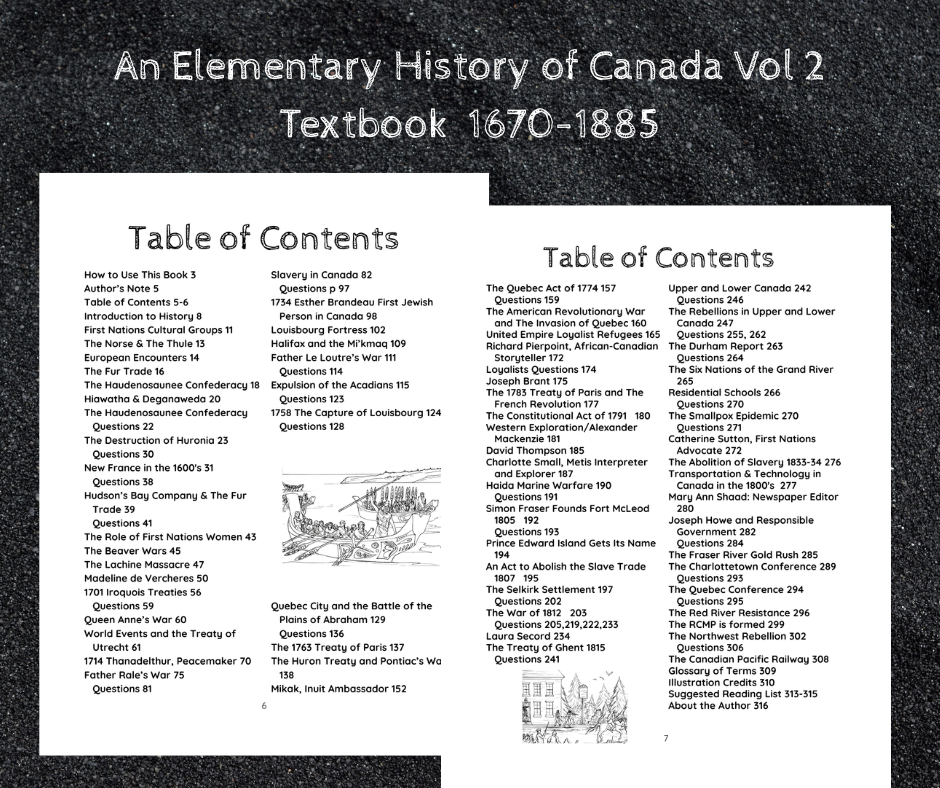 It picks up where Volume 1 left off, covering 1670-1885 in Canada’s timeline. Some of the topics include: The Haudenosaunee Confederacy, the Capture of Louisbourg Fortress, The Wabanaki Confederacy, The Beaver Wars, The Battle of the Plains of Abraham, Western Exploration, The Six Nations of the Grand River, The Expusion of the Acadians, The United Empire Loyalist Refugees, The Selkirk Settlement, The War of 1812, Responsible Government, Confederation, and more! For those who like to see the written page.