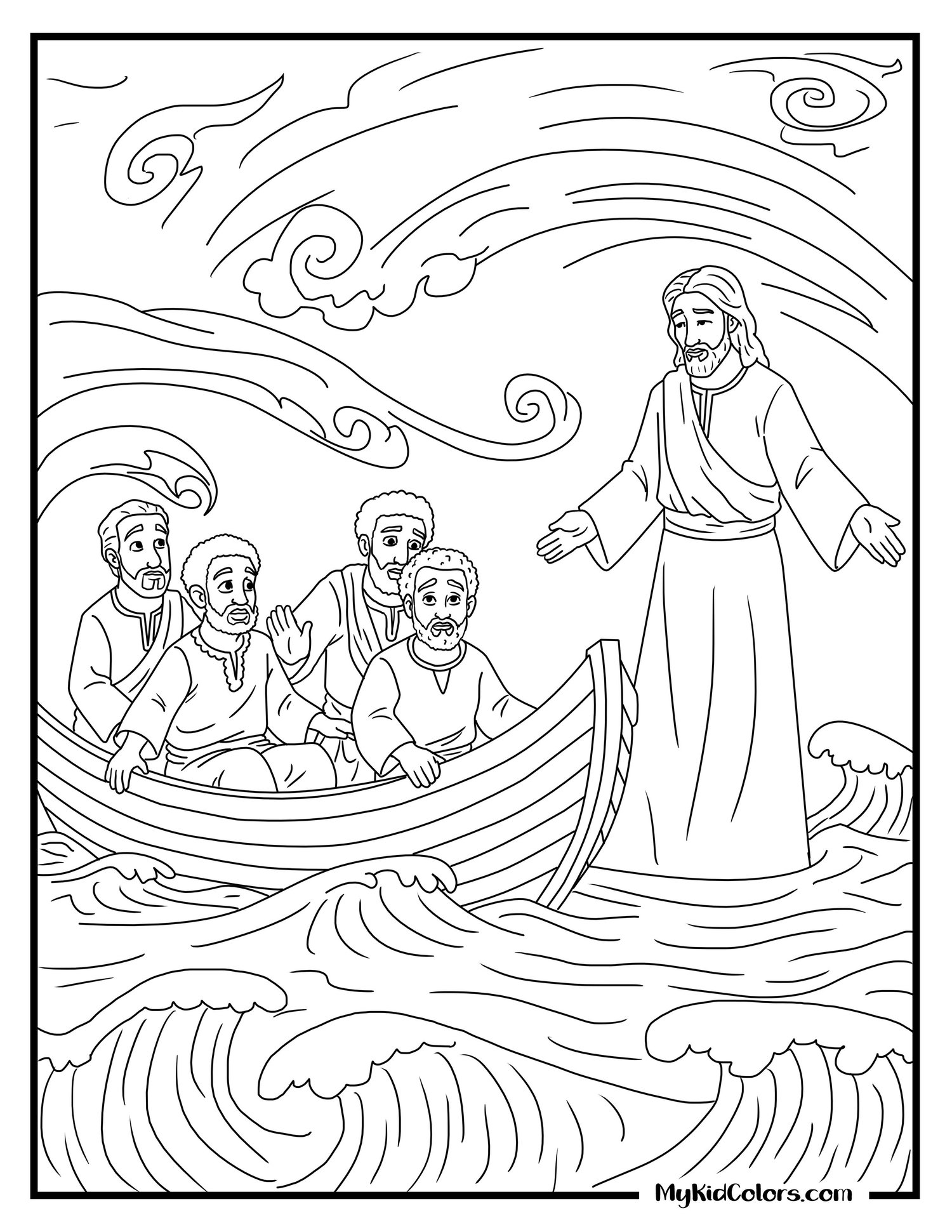 Free Hand-Drawn Inclusive Jesus Walks on Water Coloring Pages (15 Human-Drawn Bible Story Printables for Kids)