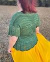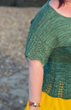Eridani is a short sleeved, slightly cropped length tee knit seamlessly from the lower lace edging in the round to the armholes. Once the upper front and back have been worked stitches are picked up for the lace sleeves.
