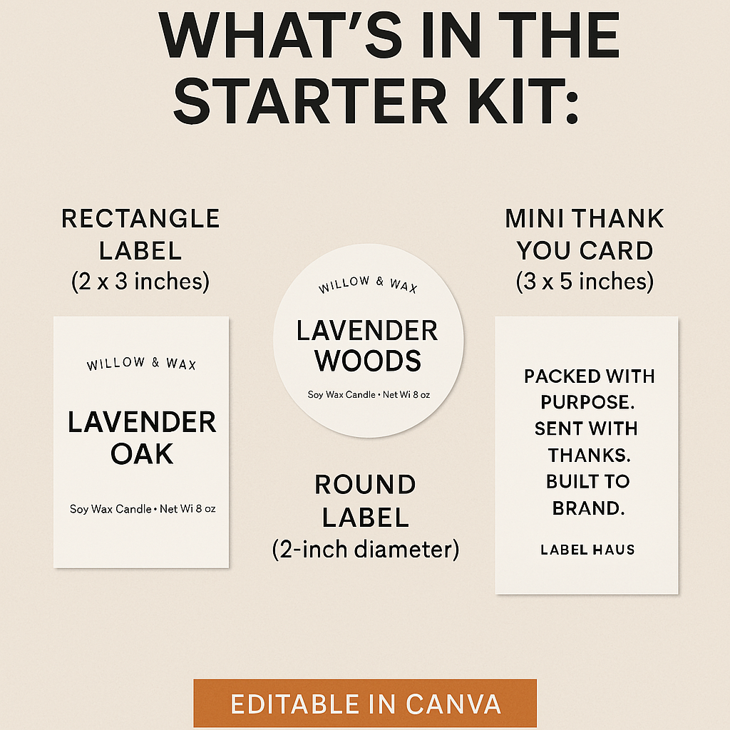 This $5 Starter Kit gives you editable Canva templates for clean, minimal product labels — perfect for candles, skincare, soaps, or anything small-batch.
