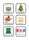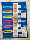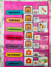 Each set included: - Chart - Laminated Days of the Week Cards - Laminated Daily Cards (home, school, grocery, cleaning, gardening, swimming, play date, movies, dentist visit, doctor visit, visiting grandparents) - Laminated Weather Cards (Sunny, rainy, cloudy, stormy, windy, snowy) - Laminated Holiday Cards - Laminated Sports/Activity Card - Two command hooks to hang the chart - Clothes Pin to mark the Day