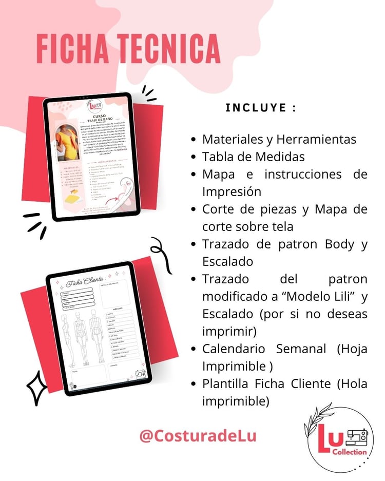 Ficha Técnica detallada con todas las especificaciones para la impresión del patrón, así como las indicaciones precisas para el trazado si prefieres no imprimir, Lista de Materiales necesarios para tu confección, Detalles de los Cortes de las Piezas, para que no se te escape ningún paso, y Tabla de Medidas.