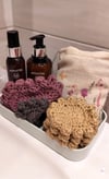 This is a pattern that starts with a face scrubby, then grows to a washcloth, shower mat, bath mat and finally a bath runner. You can choose to make all, or just some of the items and I have provided a detailed chart that will give you the amounts of yarn needed for each.