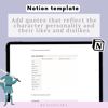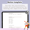 This is a Notion template made for writers who want to work on the characters for their stories and novels. If you're ready to start designing your characters and completing with their personal information, likes and dislikes, romantic and family life, and more...this is the perfect Notion template for you!