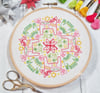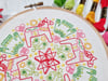 A mandala inspired hand embroidery pattern with Scandi inspired motifs like Dala horses, a knitted sweater, woven hearts and more.