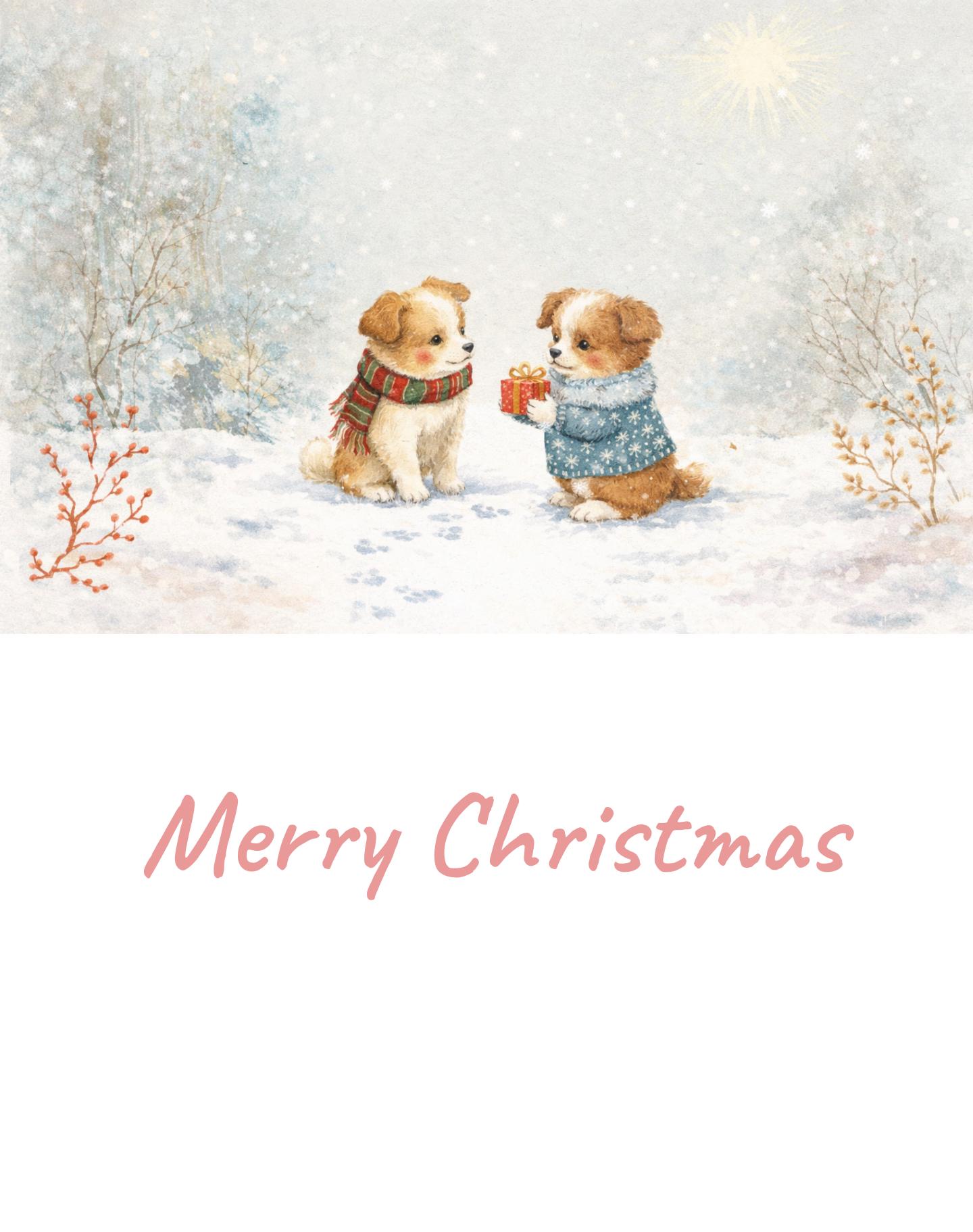 This Christmas card captures the pure warmth of the season through a soft, hand-painted watercolor style. At the heart of the design, two adorable puppies stand in a quiet snowy landscape—one gently offering a tiny wrapped gift, the other receiving it with innocent joy. Their cozy winter sweaters, rosy cheeks, and tender expressions instantly evoke feelings of love, sharing, and heartfelt togetherness.