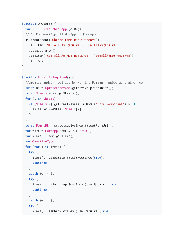 This is the code used to setup a menu in a Google Form's Response Spreadsheet to change all the questions to either required or not required.