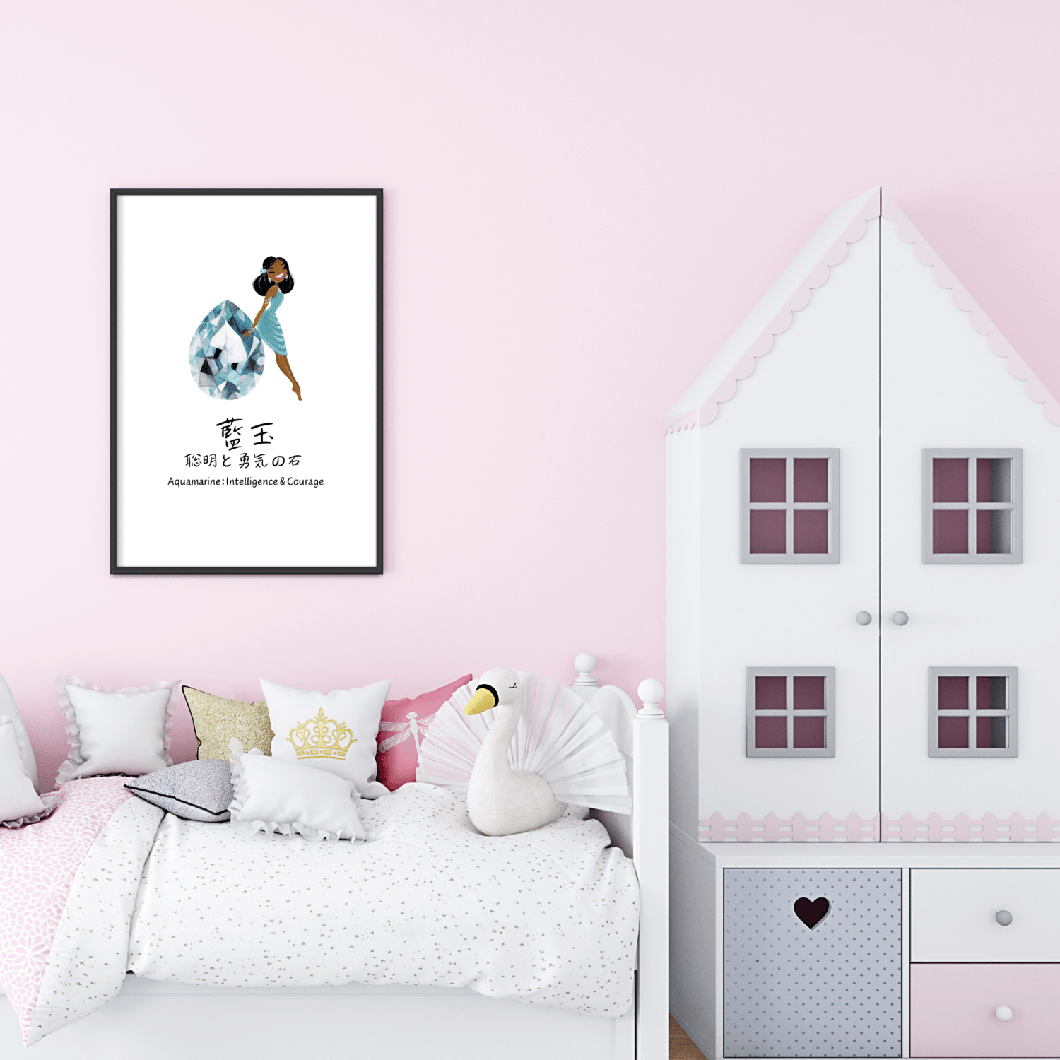 This stunning wall art features the March birthstone, Aquamarine, depicted in a stylish illustration of a fashionable woman. Printed on high-quality paper, this piece combines the calming sea-blue hues of Aquamarine with quotes in both Japanese and English, explaining the birthstone's significance.